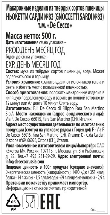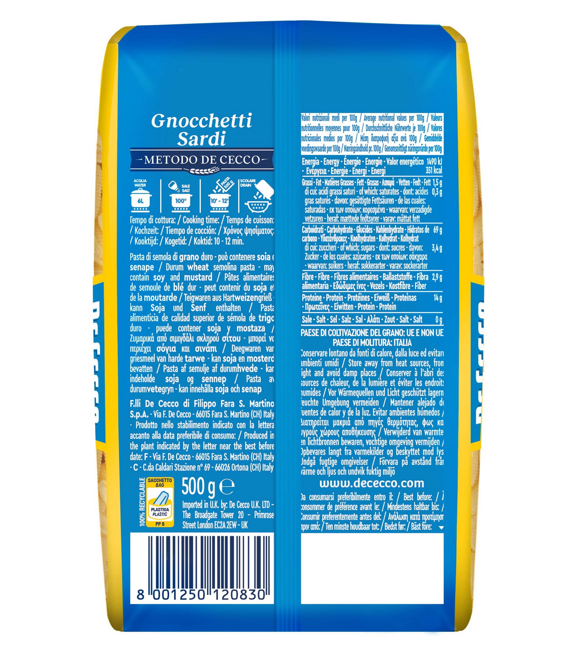 Макароны De Cecco Ньокетти сарди №83, 500г
