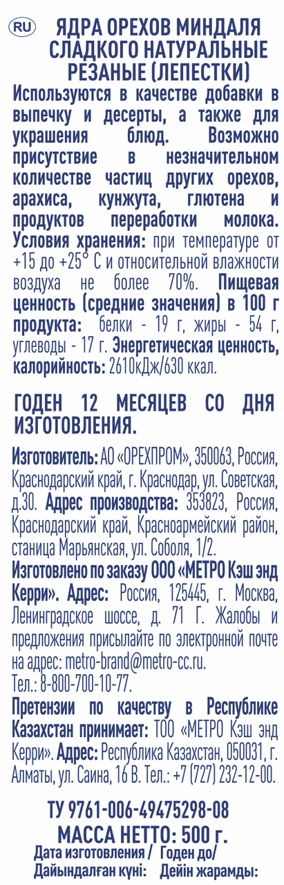 METRO Chef Лепестки миндальные резаные, 500 г – незаменимый компонент не только для десертов, но и для многих других блюд. Миндаль имеет ярко выраженный и насыщенный вкус, поэтому он нередко входит в мясные, рыбные и овощные рецепты. Миндальные лепестки – это тонко нарезанные слайсы обжаренного миндаля. Они зачастую используются для оформления кондитерских изделий: тортов, пирожных, пирогов и прочих десертов. Миндальные лепестки придают лакомству не только соблазнительный внешний вид, но и пикантный вкус с оригинальным послевкусием. Ко всему прочему миндаль как орех богат полезными витаминами и минералами. Его в умеренном количестве рекомендуется включать в ежедневный рацион. После вскрытия упаковки продукт следует пересыпать в емкость с плотн�� завинчивающейся крышкой.