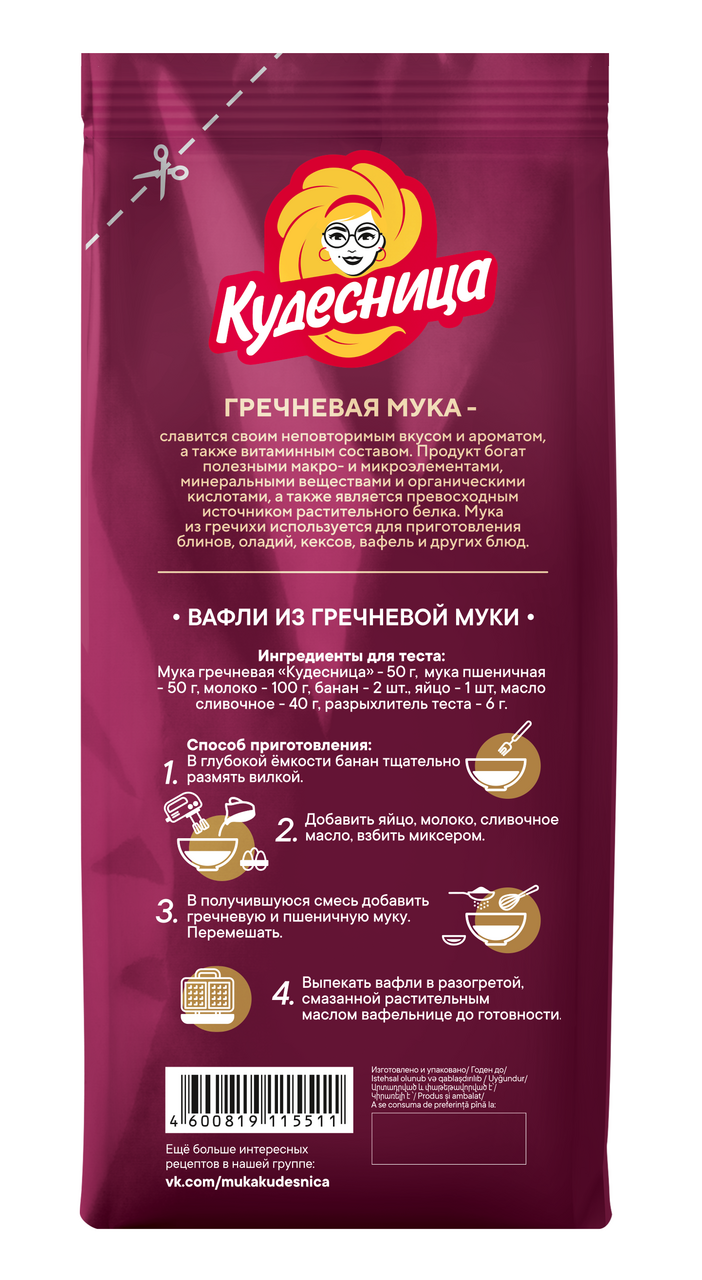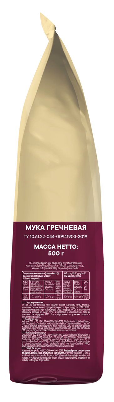 Мука вырабатывается из гречневой крупы, имеет свойственные данному продукту цвет и запах. Не содержит ГМО.В состав гречневой муки входит множество макро- и микроэлементов, минеральных веществ и органических кислот. Благодаря этому, гречневая мука обладает высокой питательной ценностью, и отлично подойдет тем, кто следит за своим здоровьем.