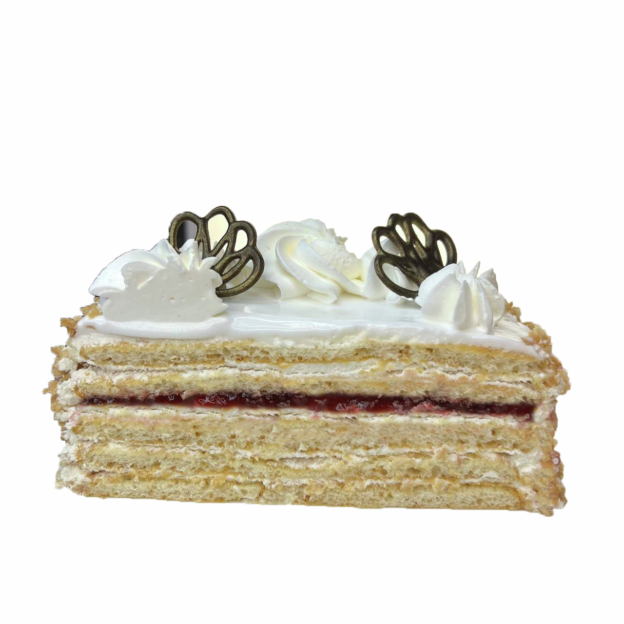 Пять тоненьких бисквитов на сгущённом молоке, молочный крем, клубничная начинка.