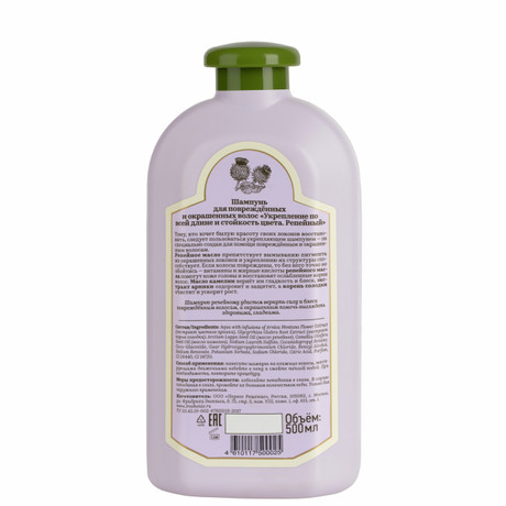 Специально создан для помощи поврежденным и окрашенным волосам. Репейное масло препятствует вымыванию пигмента из окрашенных локонов и укреплению их структуры способствует. Если волосы повреждены, то без него точно не обойтись – витамины и жирные кислоты репейного масла помогут коже головы и восстановят ослабленные корни волос. Масло камелии вернёт им гладкость и блеск, экстракт арники оздоровит и защитит, а корень солодки очистит и ускорит рост.