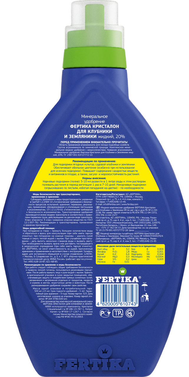 Удобрение Fertika Kristalon для клубники, 500мл представляет собой продукцию, которая включает в себя целый комплекс из микроэлементов и минералов. Идеально подходит для дачного или садового участка. При грамотном использовании средство способствует правильному росту и развитию растений. Благодаря этому можно добиться обильного цветения и хорошего урожая в любой сезон. Продукция разработана специально для того, чтобы использоваться в качестве подкормки для земляники, садовой клубники, плодово-ягодных культур. Она позволяет избежать появления и развития магниевого и железного хлороза листьев. Также с ее помощью можно увеличить содержание витаминов и сахаристых веществ в плодах. Дополнительно удобрение способствует увеличению засухо- и морозоустойчивости растений. Чтобы улучшить результаты до максимально возможных показателей, рекомендуется прибегать к осенней подкормке ягодных кустов. Средство поставляется в виде жидкого концентрата в удобной пластиковой упаковке. Оно отличается экономичным расходом. Способ применения простой – в 1 л воды нужно развести 8-10 мл продукции. Получившимся раствором необходимо подкармливать растения в весенний сезон при возобновлении вегетации и в фазе, когда у растений формируются бутоны. Также удобрение можно использовать после сбора урожая – в этом случае растения в некоторой степени восполняет свои жизненные силы. Приблизительный расход готового раствора составляет 2-3 л на каждый квадратный метр.