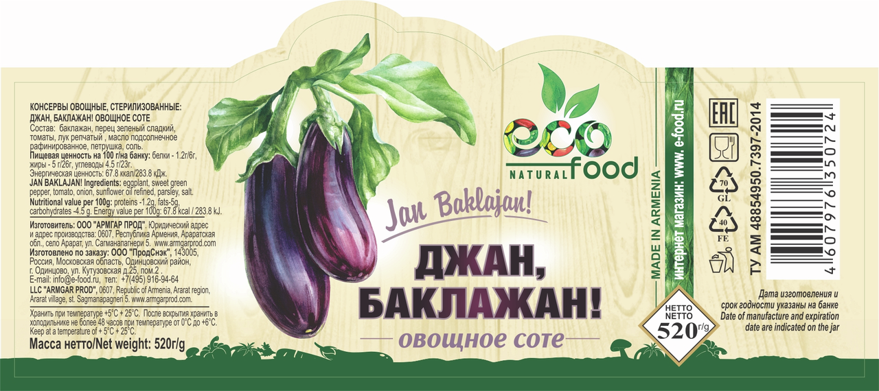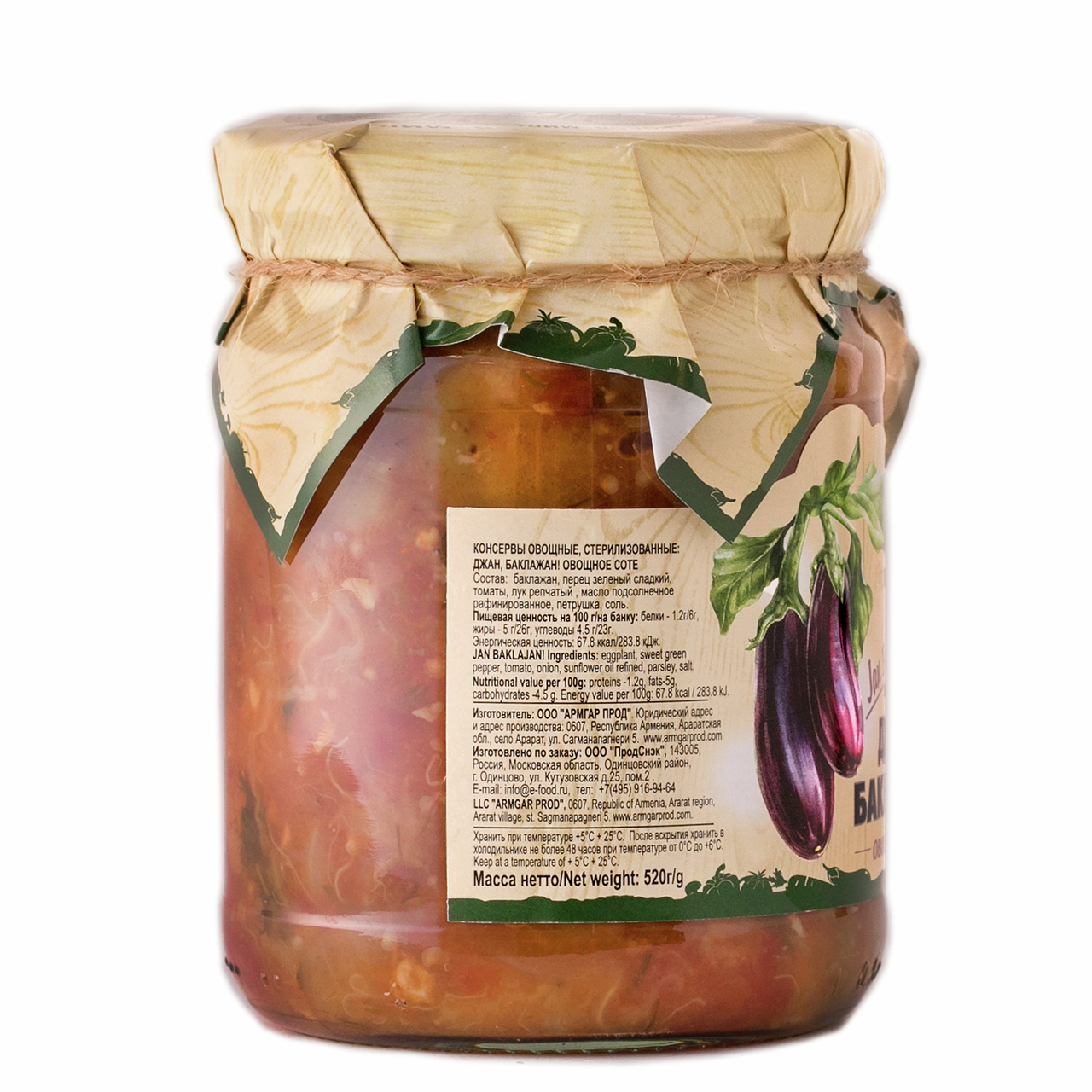 Джан Баклажан - это овощное соте от Ecofood, которое представляет собой смесь баклажанов, помидоров и сладкого перца. Это уникальное сочетание классических ингредиентов, которое раскрывает их по-новому. Этот продукт подходит для вегетарианцев и людей, соблюдающих пост, благодаря своему составу. Это отличный выбор для тех, кто ценит вкус и пользу овощей, а также для тех, кто ищет новые и интересные рецепты для своего стола.
