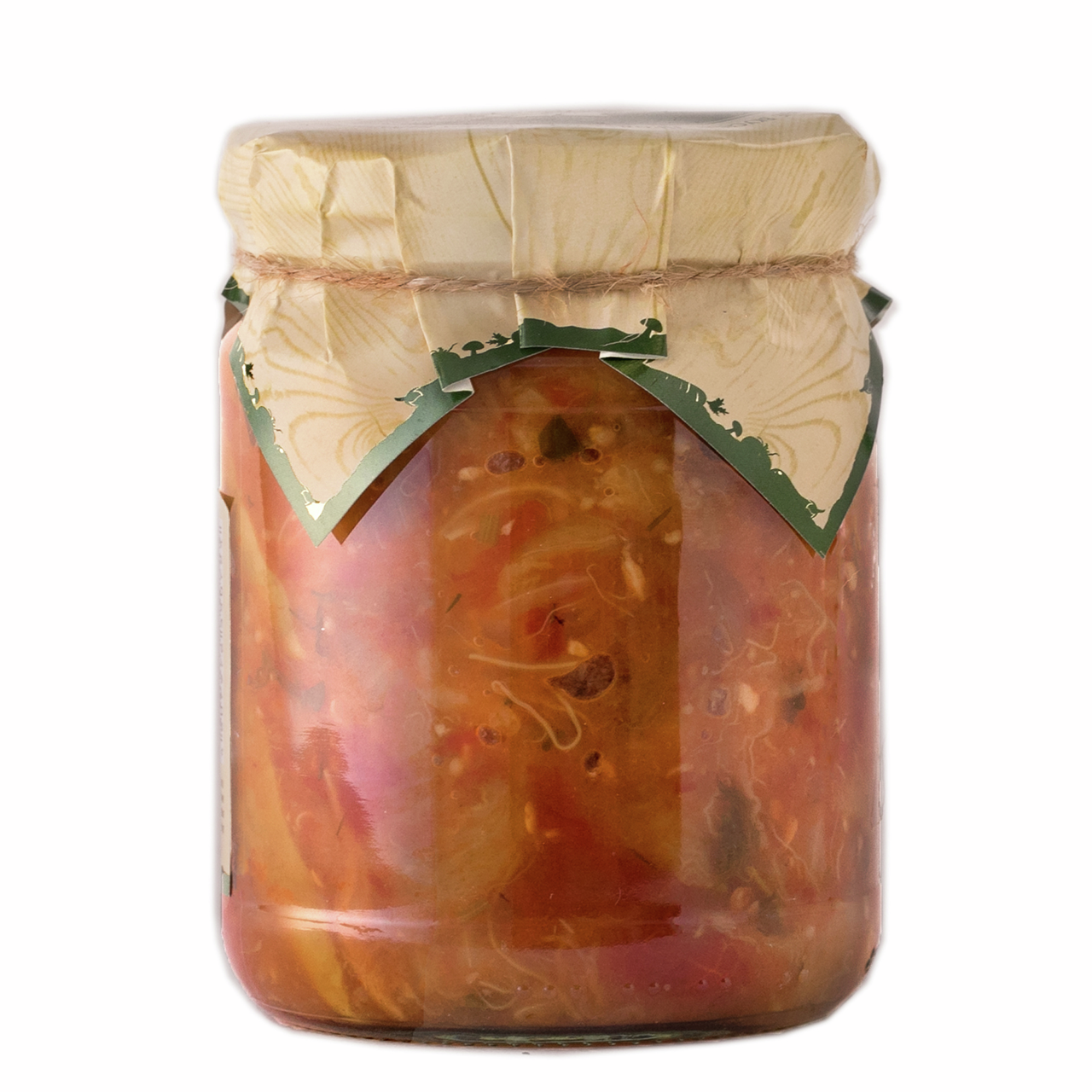 Баклажан, перец зеленый сладкий, томаты, лук репчатый, масло подсолнечное рафинированное, петрушка, соль.