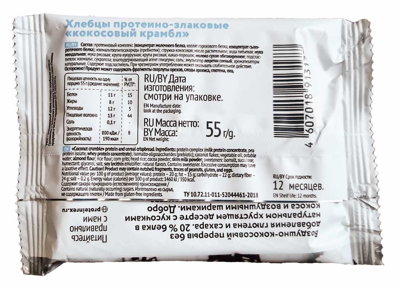 Хлебцы протеино-злаковые ProteinRex Crispy Кокосовый крамбл, 55г х 12 шт
