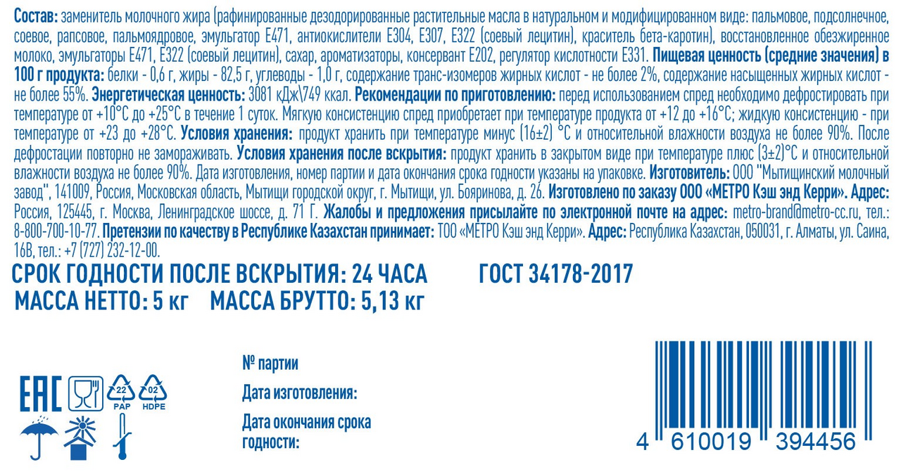 aro Спред растительно-жировой замороженный ГОСТ 82.5%, 5кг обладает нежным сливочным вкусом, мягкой и пластичной консистенцией. Идеально подходит для использования в кулинарии и хлебопекарной промышленности. Перед использованием спред необходимо дефростировать при температуре от +10C до +25C в течение 1 суток. Мягкую консистенцию спред приобретает при температуре от +12 до +16C; жидкую консистенцию - при температуре от +23 до +28C.