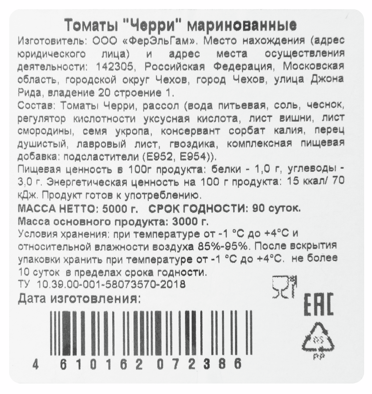 Черри, рассол вода питьевая, соль, чеснок, регулятор кислотности уксусная кислота, лист вишни, лист смородины, семя укропа, консервант сорбат калия, перец душистый, лавровый лист, гвоздика, комплексная пищевая добавка: подсластитель Е952, Е954, чеснок, перец душистый.