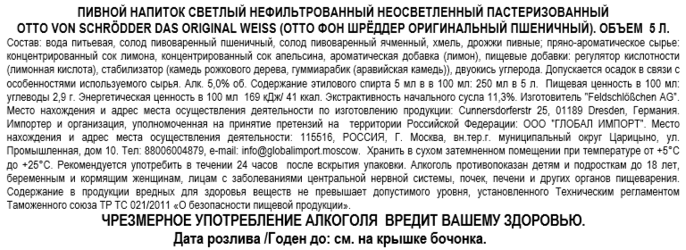 Напиток пивной Otto Von Schrodder Original Weiss светлое нефильтрованное, 5л