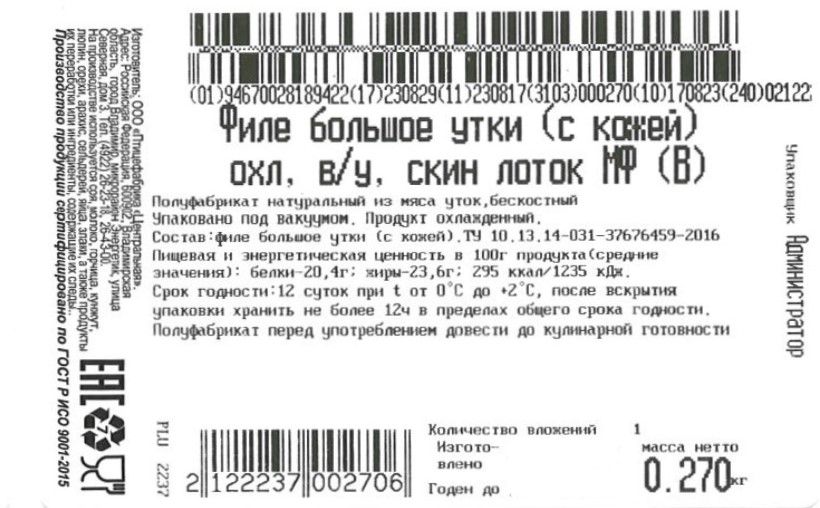 Филе большое утки с кожей.