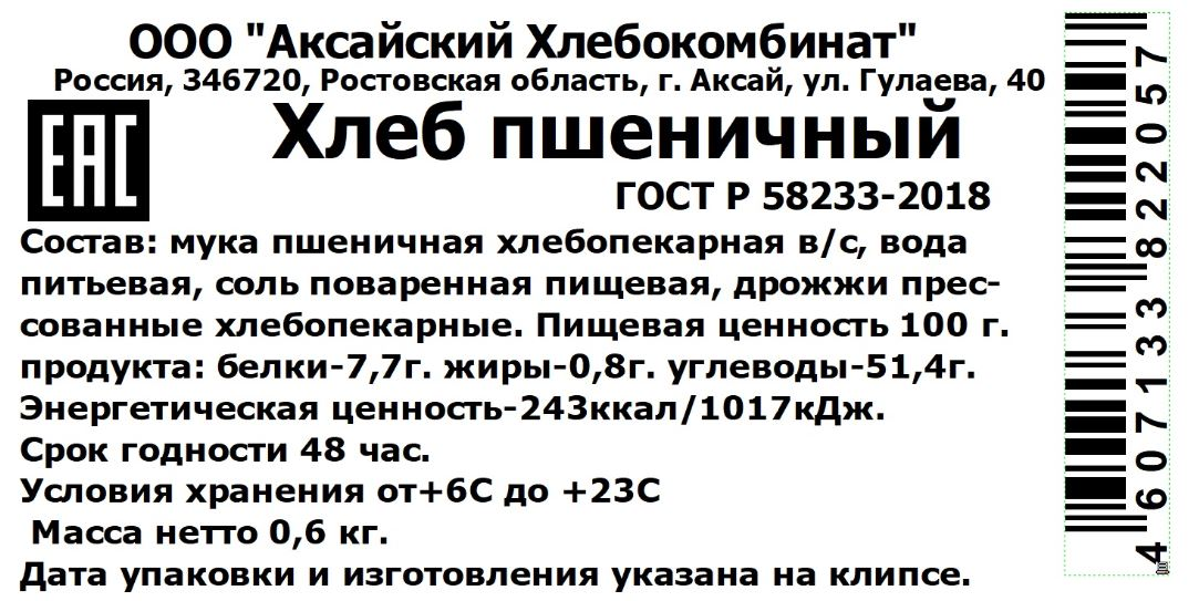 Хлеб Аксайский пшеничный формовой, 600г