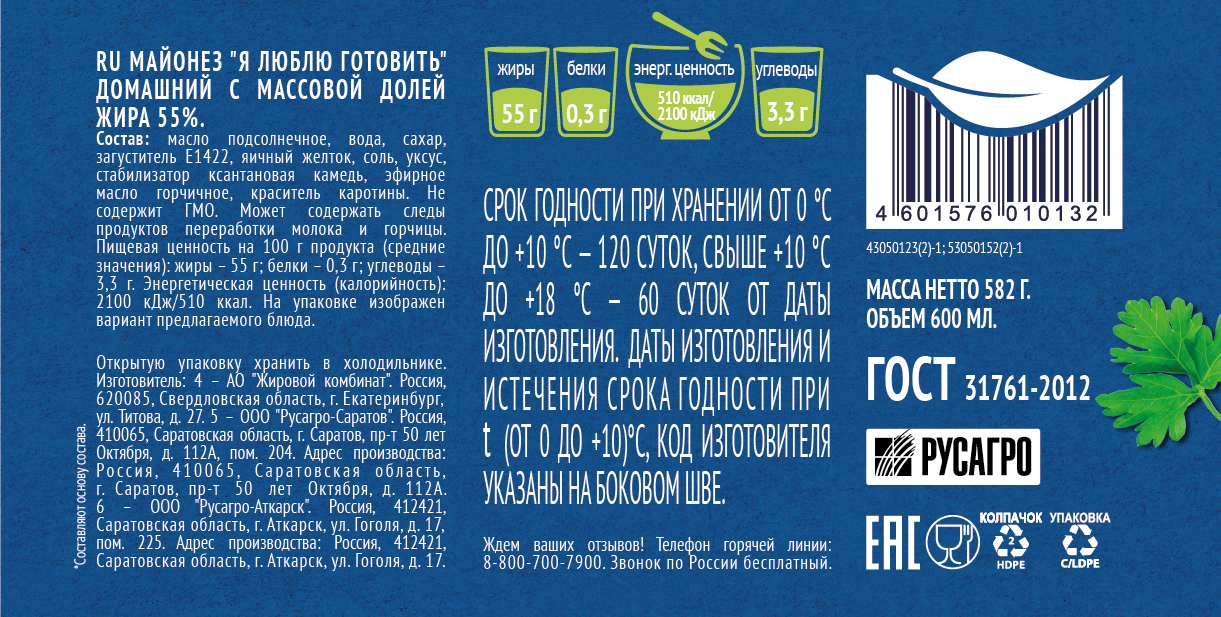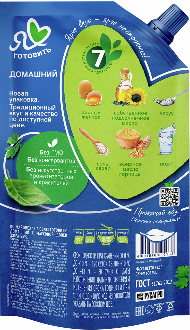 Майонез Я люблю готовить Московский провансаль Домашний 55%, 600мл обладает приятным запахом, густой консистенцией и идеально сбалансированной текстурой, благодаря строго продуманному количеству желтка, масла, уксуса и специй. Идеально подходит для приготовления закусок, канапе, салатов и вторых блюд.