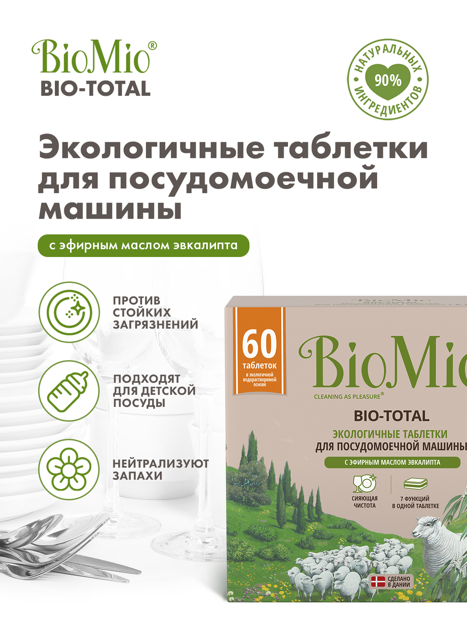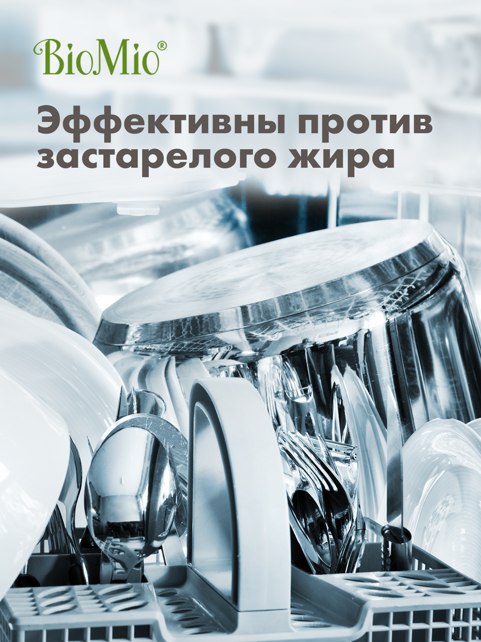Экологичные таблетки для посудомоечной машины 7-в-1 BioMio с эфирным маслом эвкалипта легко отмывают посуду даже с пригоревшей пищей. Нейтрализуют запахи. Придают стеклу ослепительный блеск. Смягчают воду и не дают образоваться известковому налету, что продлевает срок службы машины. Эффективны даже при низких температурах и на коротких программах (от 1 часа). Перед использованием нет необходимости снимать водор��створимую обертку. Удаляют самые стойкие загрязнения даже при низких температурах, а ополаскиватель придает дополнительный блеск и сияние стеклу, нержавеющей стали. Таблетки деликатно воздействуют на стекло, смягчают воду, предупреждая образование известкового налета, способствуя более надежной и долговечной работе машины, нейтрализуют запахи. Таблетки быстро растворяются, подходят для программ не менее часа. Не содержат фосфаты и агрессивные ПАВ.