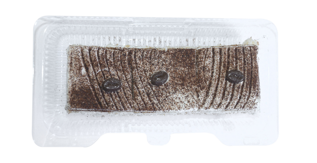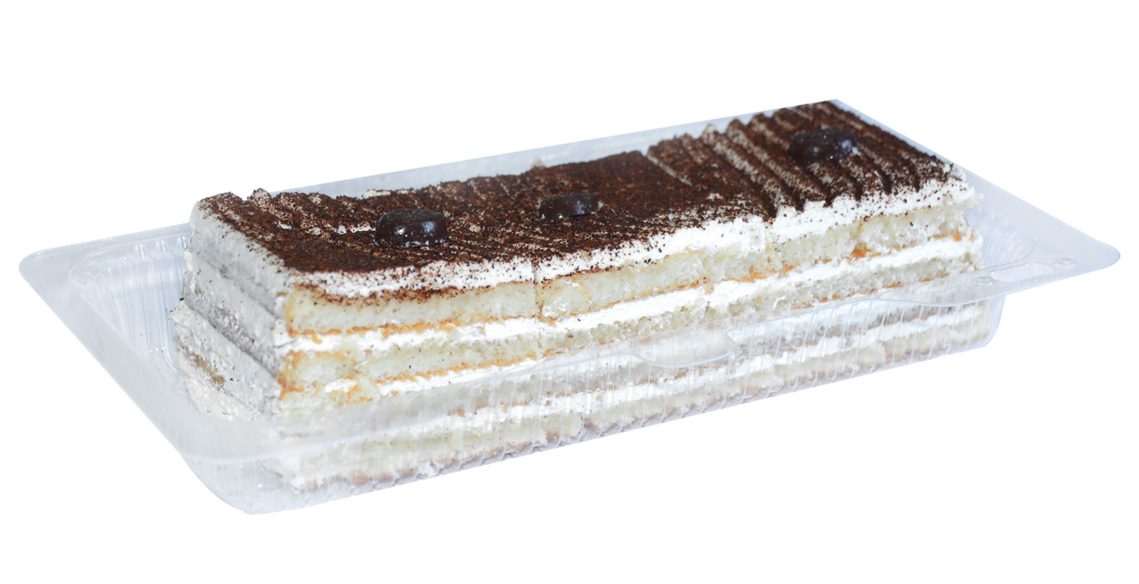 Пирожное на основе бисквитно-рулетных коржей, пропитанных сахарным сиропом, прослоенных кремом из сливок с суфле Тирамису. Пирожное декорировано сахарной пудрой шоколадной и шоколадной глазурью темной в виде кофейного зернышка.