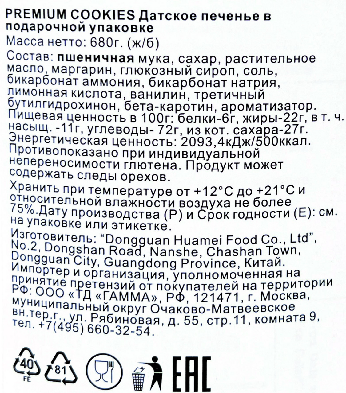 Пшеничная мука, сахар, растительное масло, маргарин, глюкозный сироп, соль, бикарбонат аммония, бикарбонат натрия, лимонная кислота, ванилин, третичный бутилгидрохинон, бета-каротин, ароматизатор.
