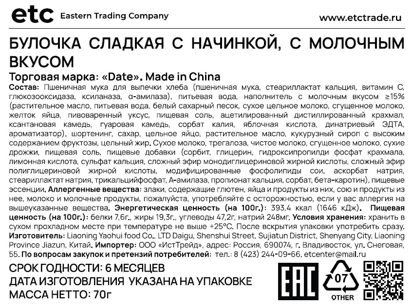 Встречайте Булочку Date с кремовой начинкой - воплощение мягкости и богатства вкуса, что делает её любимым лакомством как для взрослых, так и для детей. Сделанная с любовью и заботой, каждая булочка обещает моменты радости и удовольствия при каждом укусе. Подарите себе и своим близким время настоящего удовольствия с Булочкой Date с кремовой начинкой - где каждый укус говорит о любви и заботе. Идеально для жизни на ходу. Благодаря удобной индивидуальной упаковке, наши булочки станут вашим незаменимым спутником в любом приключении. Отлично подходят для перекуса в школе, на работе или в поездке, они также идеальны для порционного угощения детей - удобно, гигиенично и всегда вкусно.