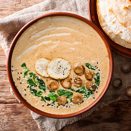 Нежнейший, густой, сливочный крем-суп с насыщенным вкусом грибов. При приготовлении добавьте сливки и подавайте с хрустящими крутонами, зеленью и кунжутом.