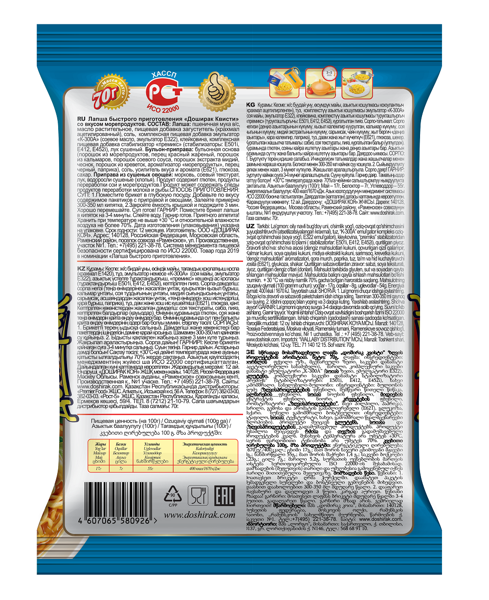 Лапша: пшеничная мука, масло растительное, пищевая добавка загуститель (крахмал ацетилированный), соль, пищевая добавка эмульгатор К-300А (соевое масло, эмульгатор E322), клейковина, комплексная пищевая добавка стабилизатор Премикс (стабилизаторы: E501i, E412, E452i), сушеная ламинария (порошок), лук сушеный; бульон-приправа: бульонная основа (порошок из морепродуктов, перец красный жареный, порошок из кальмаров, порошок соевого соуса, порошок экстракта мидий, чеснок, порошок из креветок, ароматизатор морепродукты, перец черный, паприка), соль, усилитель вкуса и аромата (E621), глюкоза, сахар; приправа из сушеных овощей: морковь, соевый текстурат, лук, водоросли сушеные (хлопья).