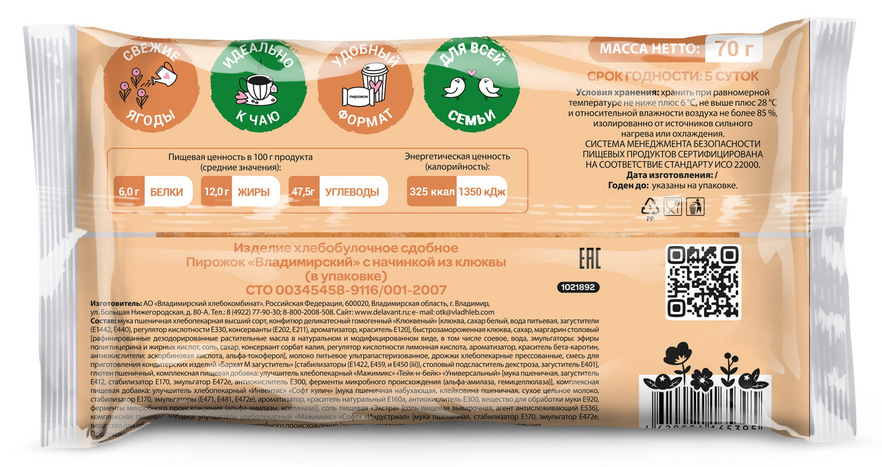 Сочный, сладкий и нежный вкус клюквы делает это угощение незабываемым. Пирожок Владимирский с начинкой из клюквы - это мягкая и пышная выпечка из сдобного теста, приготовленная по домашним рецептам. Начинка из свежих ягод сохраняет свое природное богатство и вкус, а молоко придает тесту особую нежность. Теперь в удобном формате по еще более привлекательной цене.