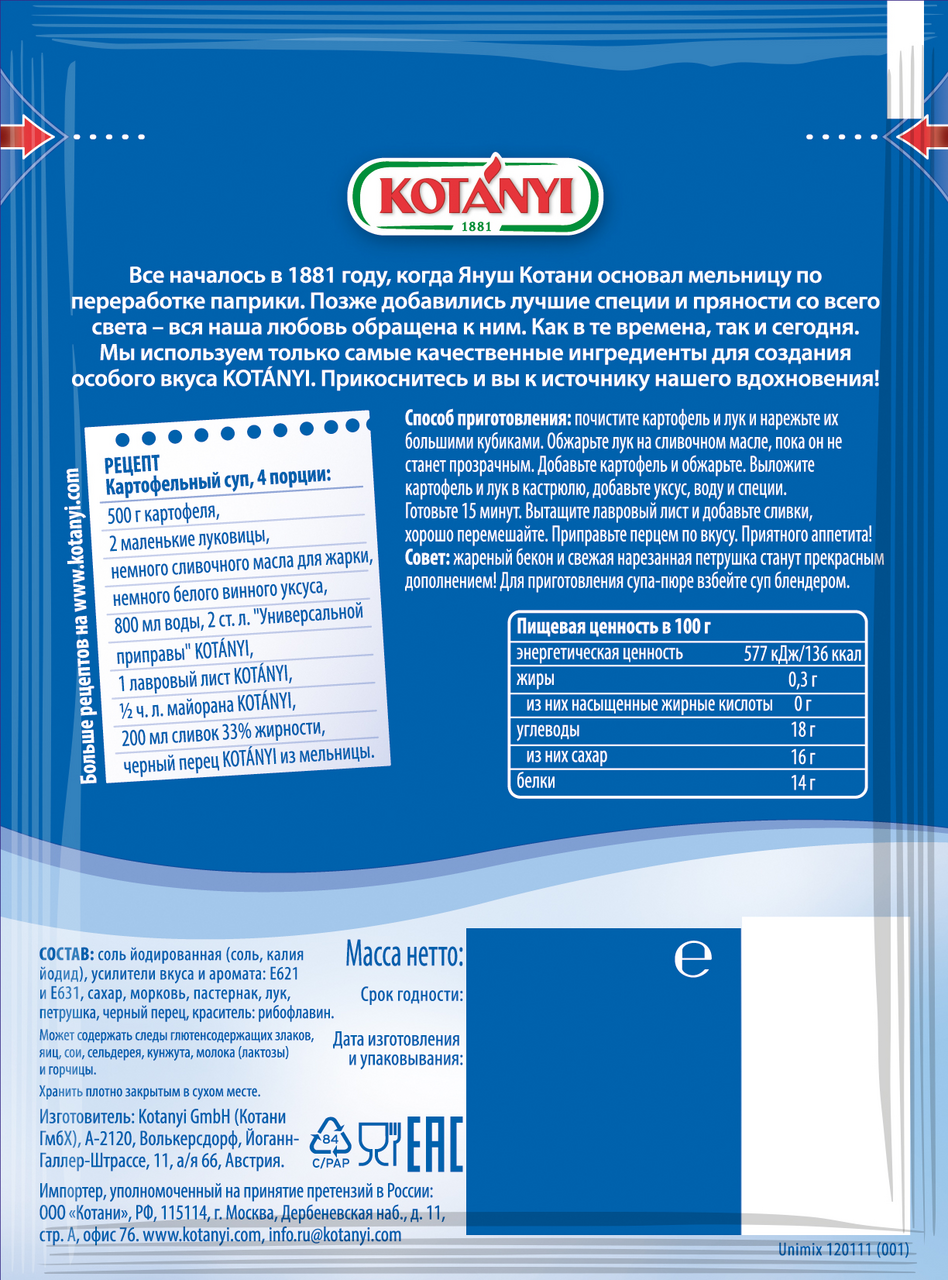 Соль йодированная (соль, калия йодид), усилители вкуса и аромата: Е621 и Е631, сахар, морковь, пастернак, лук, петрушка, черный перец, краситель: рибофлавин.