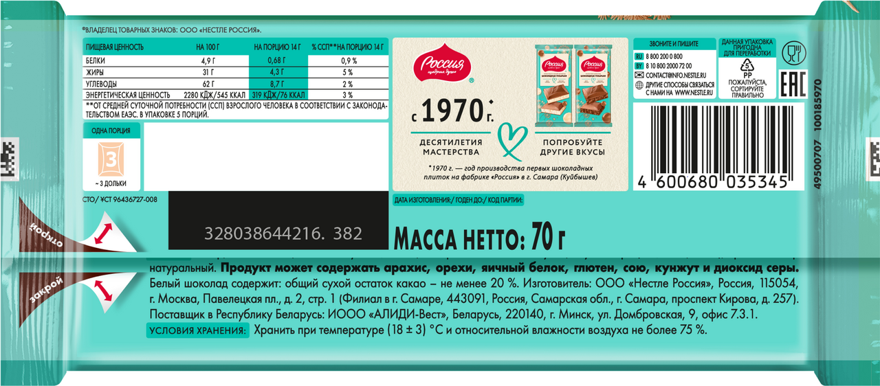 Шоколад Россия Щедрая душа белый шоколадные пузырьки, 70г