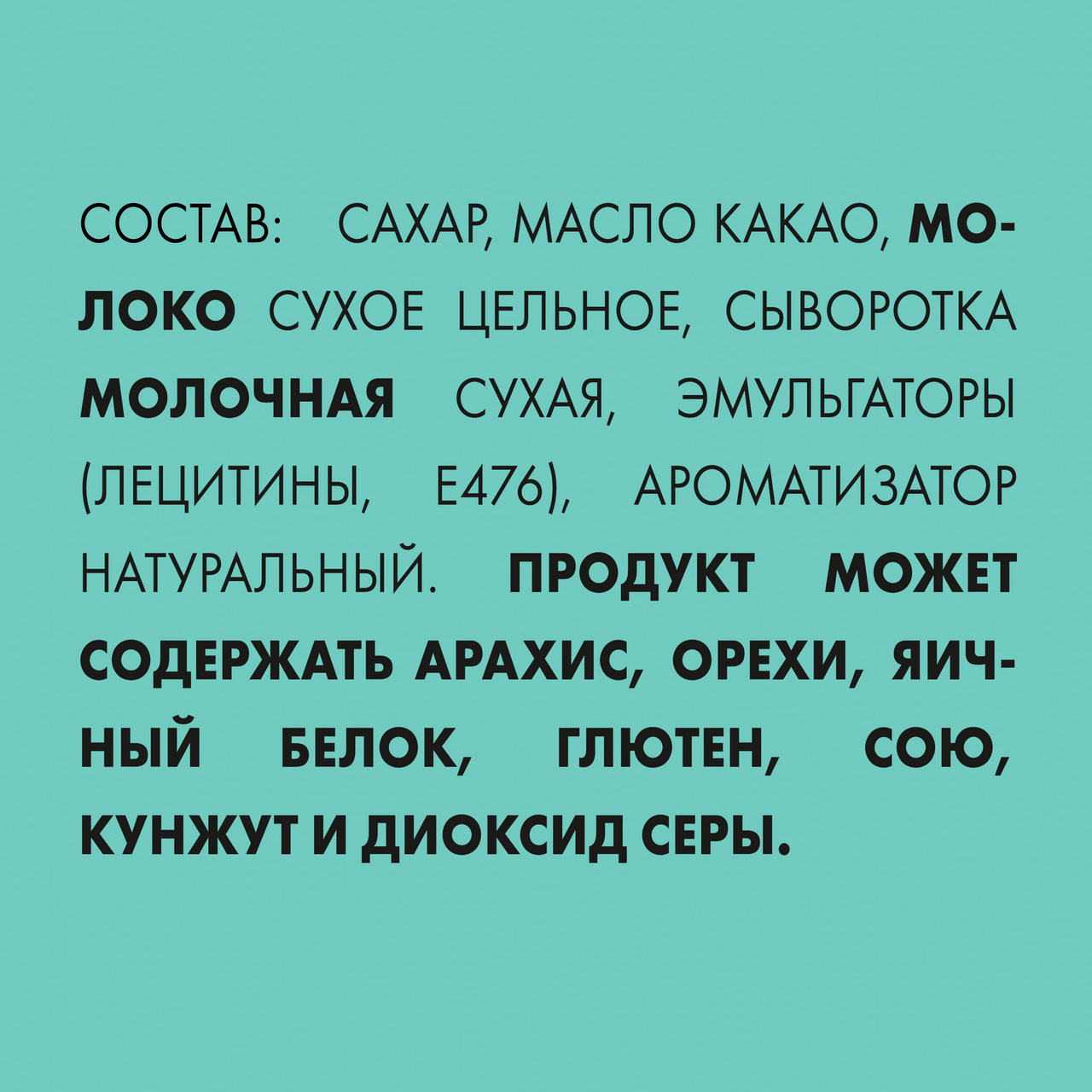 Сахар, масло какао, молоко сухое цельное, сыворотка молочная сухая, эмульгаторы (лецитины, Е476), ароматизатор натуральный.