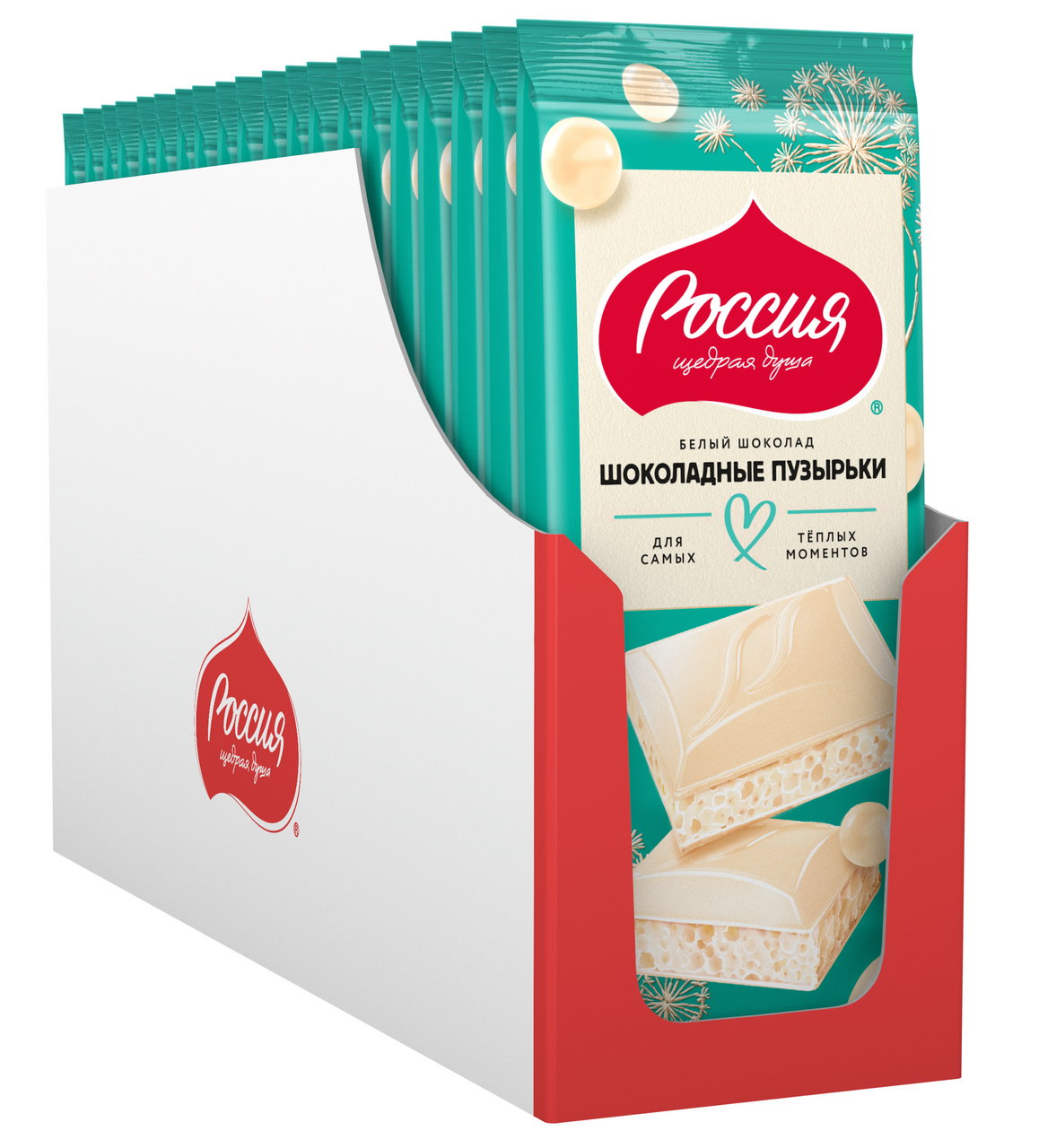 Шоколадные пузырьки от бренда Россия- щедрая душа! - это нежная воздушная классика, способная растопить ваши сердца. Отборное молоко, качественные какао-бобы и элегантный дизайн упаковки доставят вам эстетическое и гастрономическое удовольствие. Изящная обновленная форма дольки шоколада раскрывает весь яркий и насыщенный молочный вкус. Воздушные пузырьки в шоколаде медленно таят во рту, продлевая ваше удовольствие.
