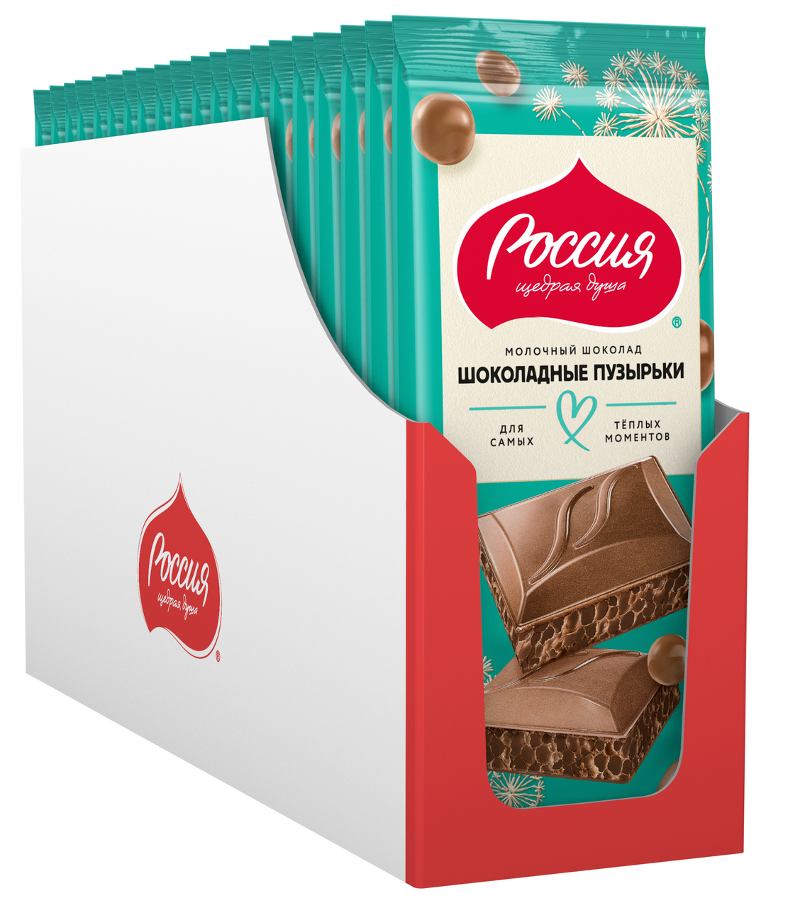 Шоколадные пузырьки от бренда Россия-щедрая душа! - это нежная воздушная классика, способная растопить ваши сердца. Отборное молоко, качественные какао-бобы и элегантный дизайн упаковки доставят вам эстетическое и гастрономическое удовольствие. Изящная обновленная форма дольки шоколада раскрывает весь яркий и насыщенный молочный вкус. Воздушные пузырьки в шоколаде медленно таят во рту, продлевая ваше удовольствие.