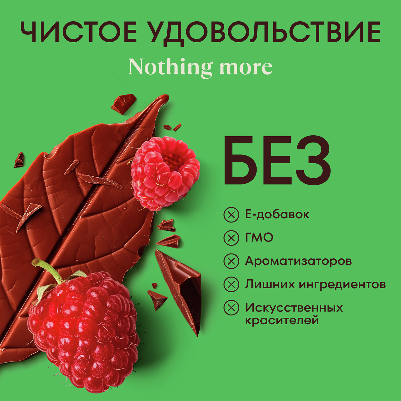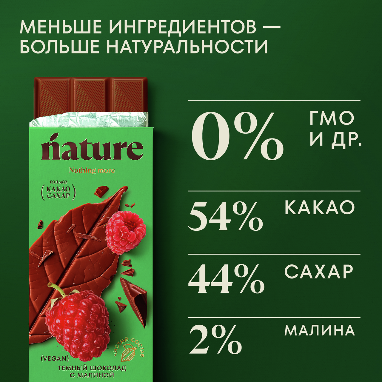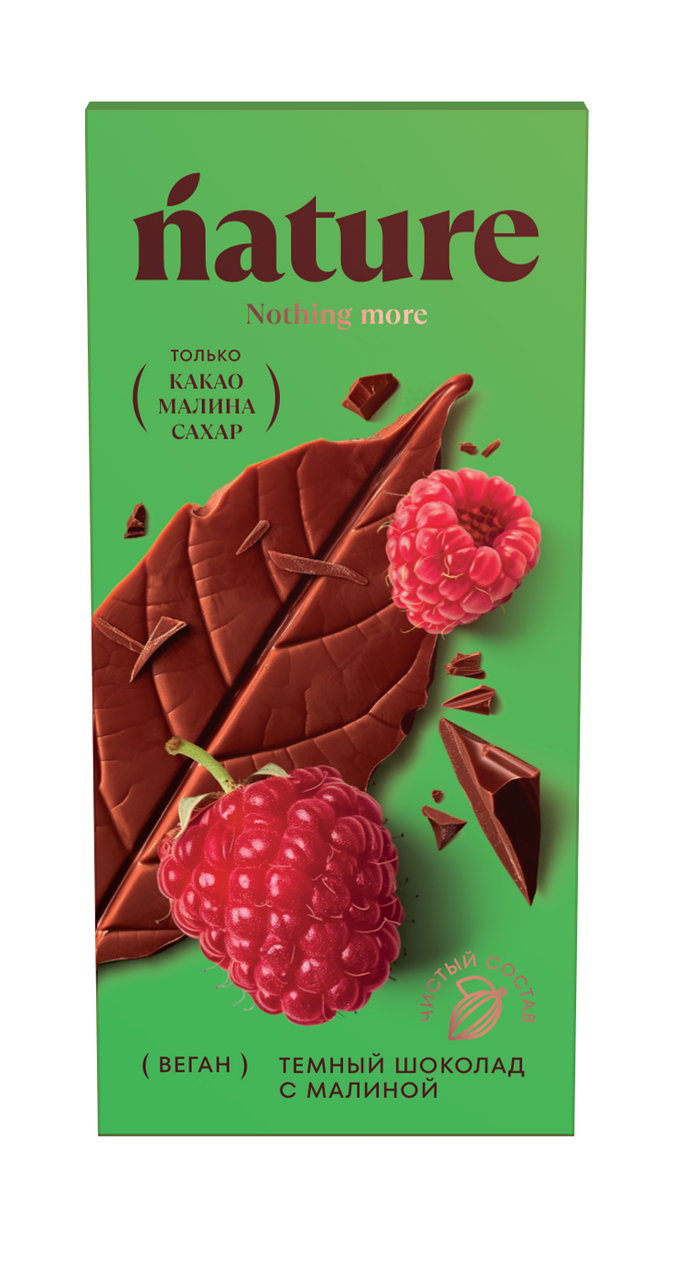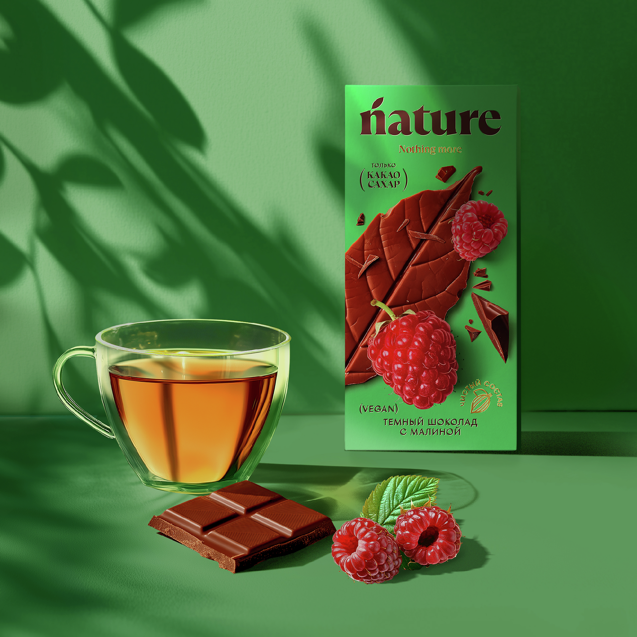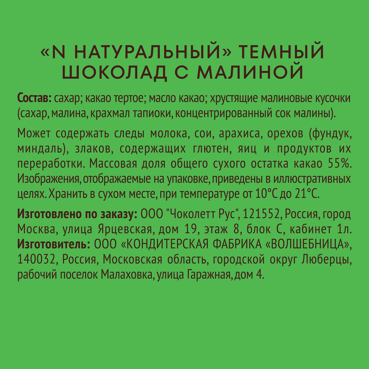 N Nature - Линейка шоколада с чистым составом: только какао и сахар + молоко, орехи или ягоды в некоторых вкусах. Классический темный шоколад, приготовленный по рецепту, в котором нет ничего лишнего. Он состоит только из натуральных ингредиентов: какао, кусочков малины и сахара, без добавления искусственных красителей, ароматизаторов и пр. Особенность этого шоколада в его чистом составе. Шоколад приготовлен из плодов и масла какао, сахара и хрустящих малиновых кусочков без искусственных красителей, ароматизаторов и Е-добавок. Благодаря отборным ингредиентам отличается насыщенным вкусом и ароматом, подаренным самой природой. В каждом кусочке N Nature ощущается натуральный вкус и аромат настоящего шоколада, так как он изготавливается из отборных какао-бобов с Берега Слоновой Кости. Они максимально раскрывают вкусовые качества шоколада.