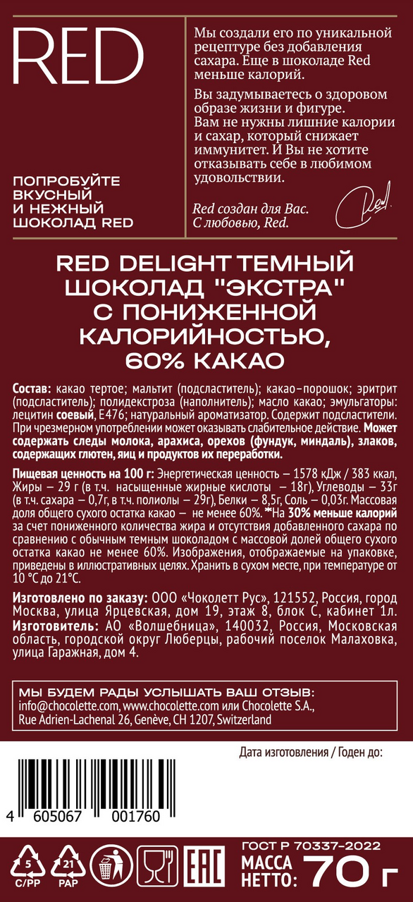 Шоколад Red Delight темный экстра 60% какао - линейка шоколада без добавленного сахара с пониженной калорийностью, сниженным содержанием жира и углеводов. Шоколад темный Red Delight приготовлен без добавления сахара - вместо него используются натуральные сахарозаменители. Благодаря этому аппетитное лакомство содержит меньше калорий и углеводов. Шоколад с тающей во рту нежной текстурой обладает выразительным сладким вкусом. Он составит удачное сочетание с чаем или кофе, пополнит запасы энергии и поднимет настроение.
