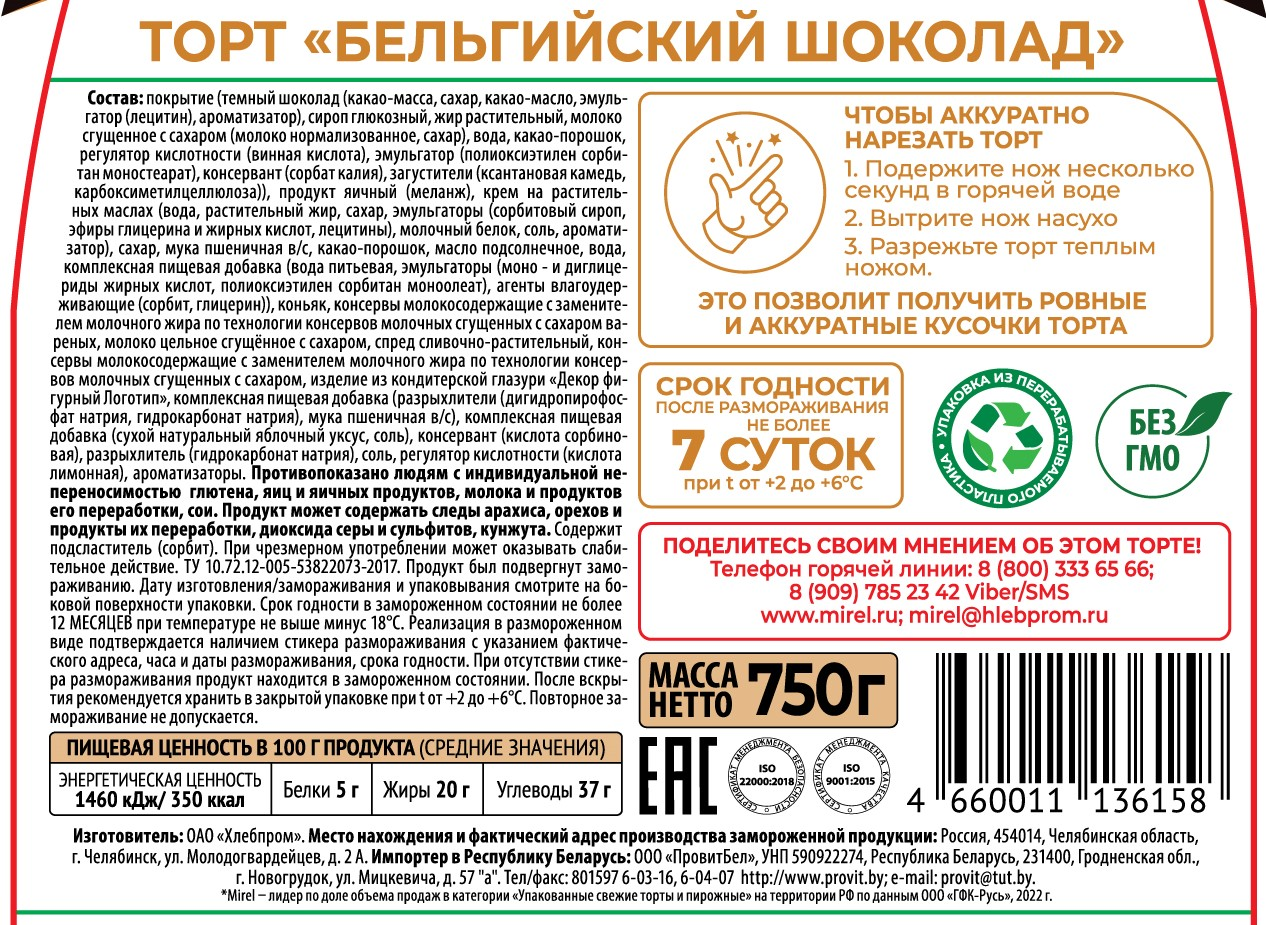 Торт Mirel Бельгийский шоколад, 750г состоит из крема с настоящим темным бельгийским шоколадом и шоколадным бисквитом с легкой коньячной ноткой.