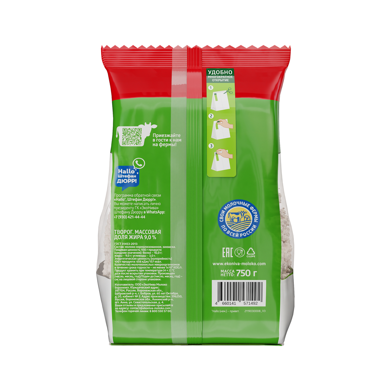 Рассыпчатый творог ЭкоНива 9% имеет простой и полностью натуральный состав — он изготовлен из молока высшего сорта при помощи заквасочной культуры. Продукт обладает чистым выраженным кисломолочным вкусом и привлекательным ароматом. В процессе упаковки творога из пакета вытесняется воздух, что позволяет избежать попадания кислорода и сохранить его свежесть длительное время без использования консервантов.В домашней кулинарии рассыпчатый творог ЭкоНива станет не только вкусной и нежной начинкой для вареников, булочек, пирогов, но и идеальной основой для сырников, запеканок, придавая им выраженный творожный вкус. Также продукт отлично подходит для завтраков, полезных перекусов и легких закусок: он удачно сочетается со сметаной и йогуртом, фруктами и ягодами, орехами и мёдом, а ещё – со свежей зеленью. Перед употреблением творог можно пропустить через сито или мясорубку, благодаря чему текстура творожного зерна станет более воздушной и однородной.
