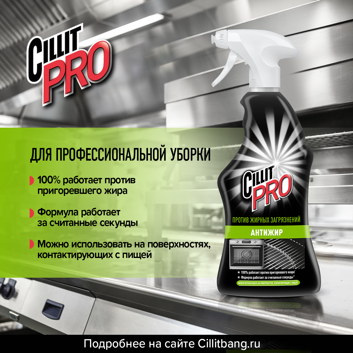Cillit Pro Антижир имеет специальную формулу для устранения самых жирных загрязнений и профессионального очищения. Отлично подходит для чистки изделий из металлов, контактирующих с пищевыми продуктами (противней, подносов, котлов, сковород, кастрюль, вертелов, шампуров, решеток гриля), кухонных (разделочных и рабочих) поверхностей (включая мраморные и поверхности из натурального камня), бытовой техники (газовых, электрических плит, холодильников и т.д.), технического и технологического оборудования в пищевой промышленности и на предприятиях общественного питания.
