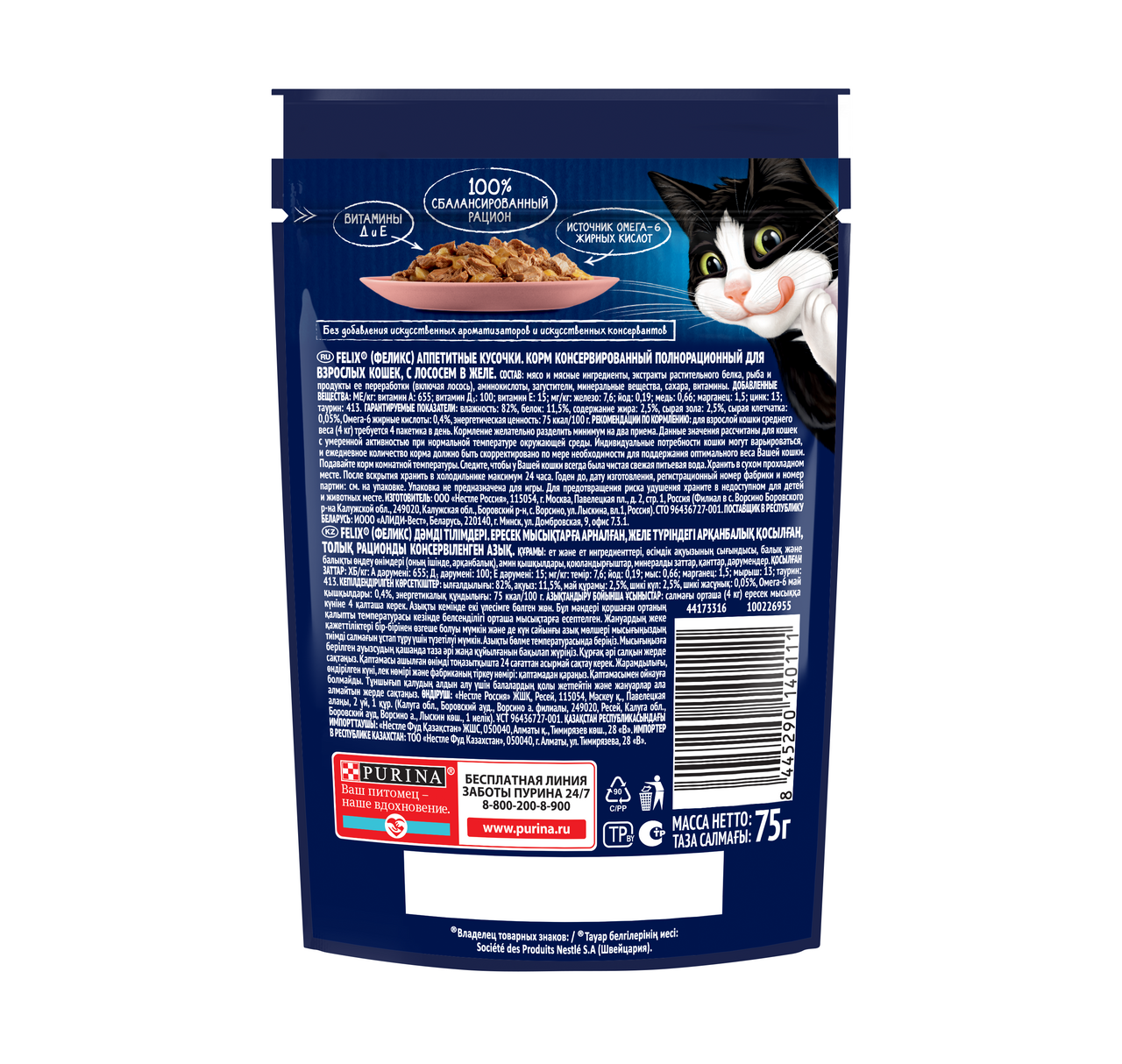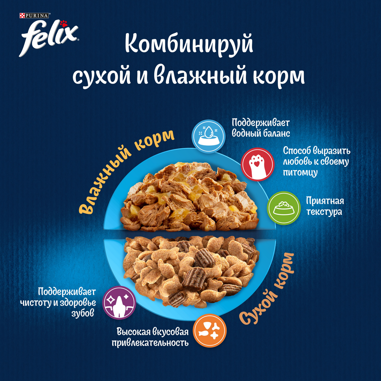 Каждый котик желает наслаждаться совершенно особенным кормом, у которого будет такой аппетитный вид и аромат, словно Вы приготовили его сами. Каждый пакетик корма для взрослых кошек Аппетитные кусочки содержит нежные кусочки в сочном желе – вкуснятину, от которой кота за уши не оттащишь. Эксперты , разрабатывая влажные корма для домашних любимцев, создали корм для взрослых кошек Felix Аппетитные кусочки — специально для Вашего любителя вкуснятины. Влажный корм для кошек Felix Аппетитные кусочки — полнорационный, содержит все необходимое для здоровой активной долгой жизни.