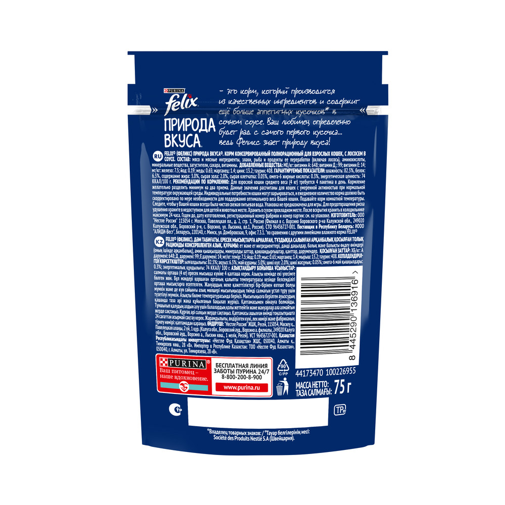 Животные инстинкты Вашего питомца не обманешь: он точно даст Вам понять, что именно ему по вкусу, и безошибочно определяет, где с аппетитным кормом можно получить и энергию для активной здоровой жизни.Эксперты Purina, разрабатывая влажные корма для домашних питомцев, создали насыщенный корм для взрослых кошек Felix Природа вкуса с аппетитными кусочками в сочном соусе. Полнорационный влажный корм обеспечит Вашего любимца всеми необходимыми питательным веществами. Корм для кошек Felix не содержит искусственных красителей. 100% сбалансированный рацион. Баланс минералов. Содержит витамины Д и Е. Источник Омега-6 жирных кислот.