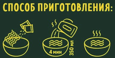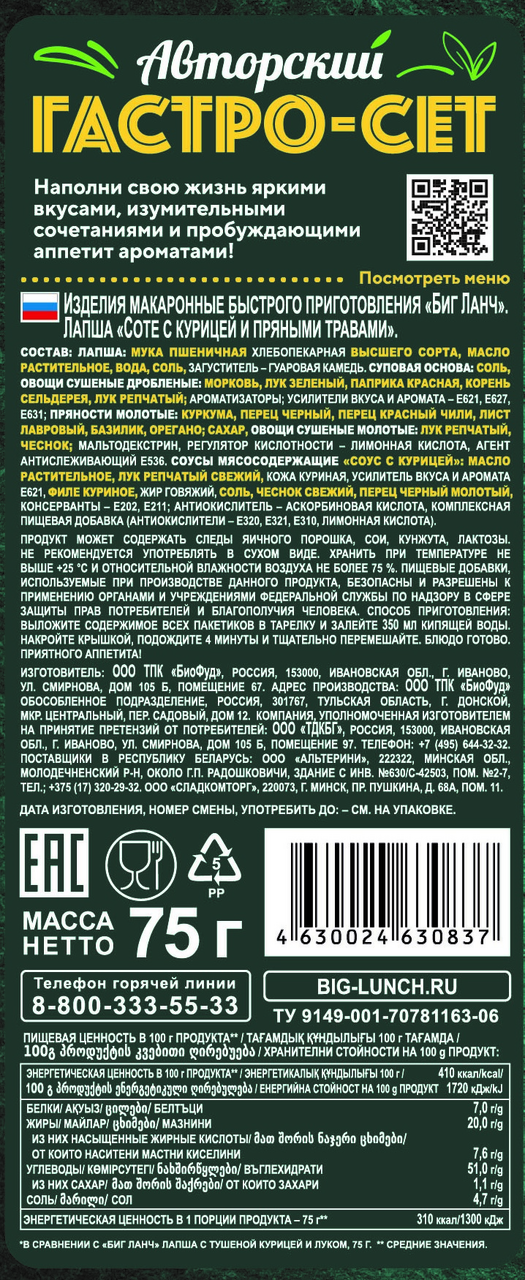 Изделия макаронные быстрого приготовления Биг Ланч. Лапша Соте с курицей и пряными травами. Выложите содержимое всех пакетиков в тарелку и залейте 350 мл кипящей воды- Накройте крышкой, подождите 4 минуты и тщательно перемешайте.- Блюдо готово. Приятного аппетита! Подходит для перекуса на работе, на учебе, на отдыхе или на природе. Удобно брать с собой, быстро заваривается. Утилизируется как бытовой отход - не надо носить с собой миски и контейнеры.