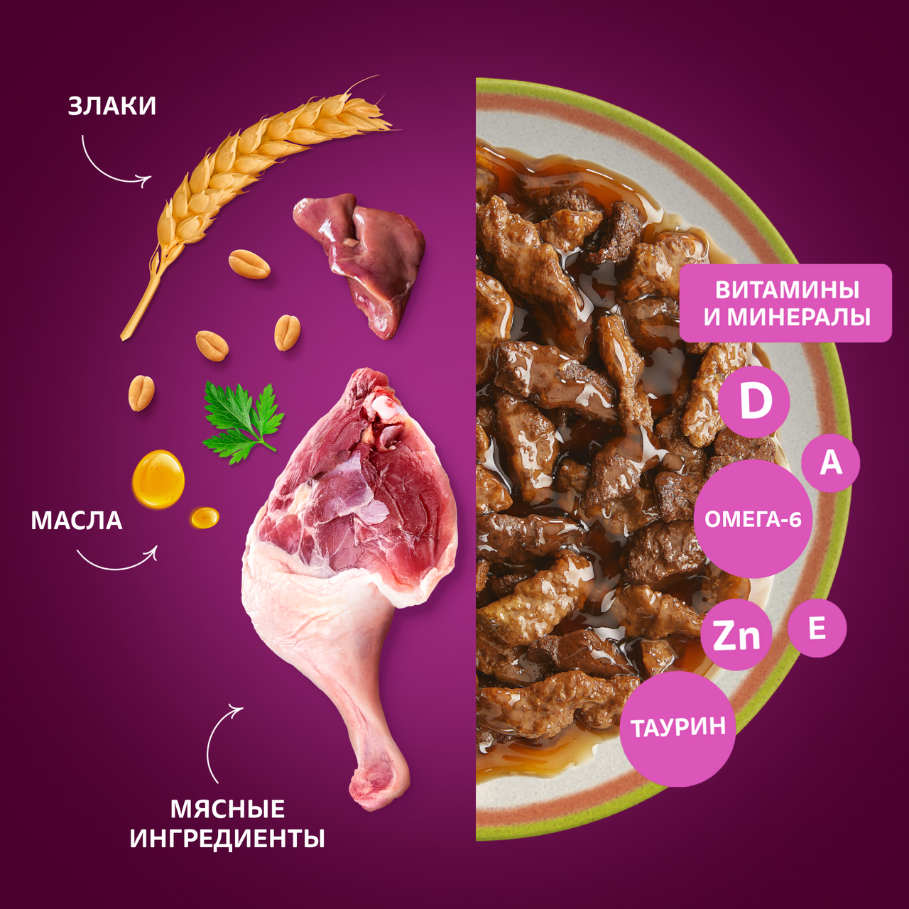 Мясо и субпродукты (в том числе утка и печень), продукты животного происхождения, пшеничная мука, загустители, аминокислоты (в том числе таурин), минеральные вещества, витамины, краситель, сахара.