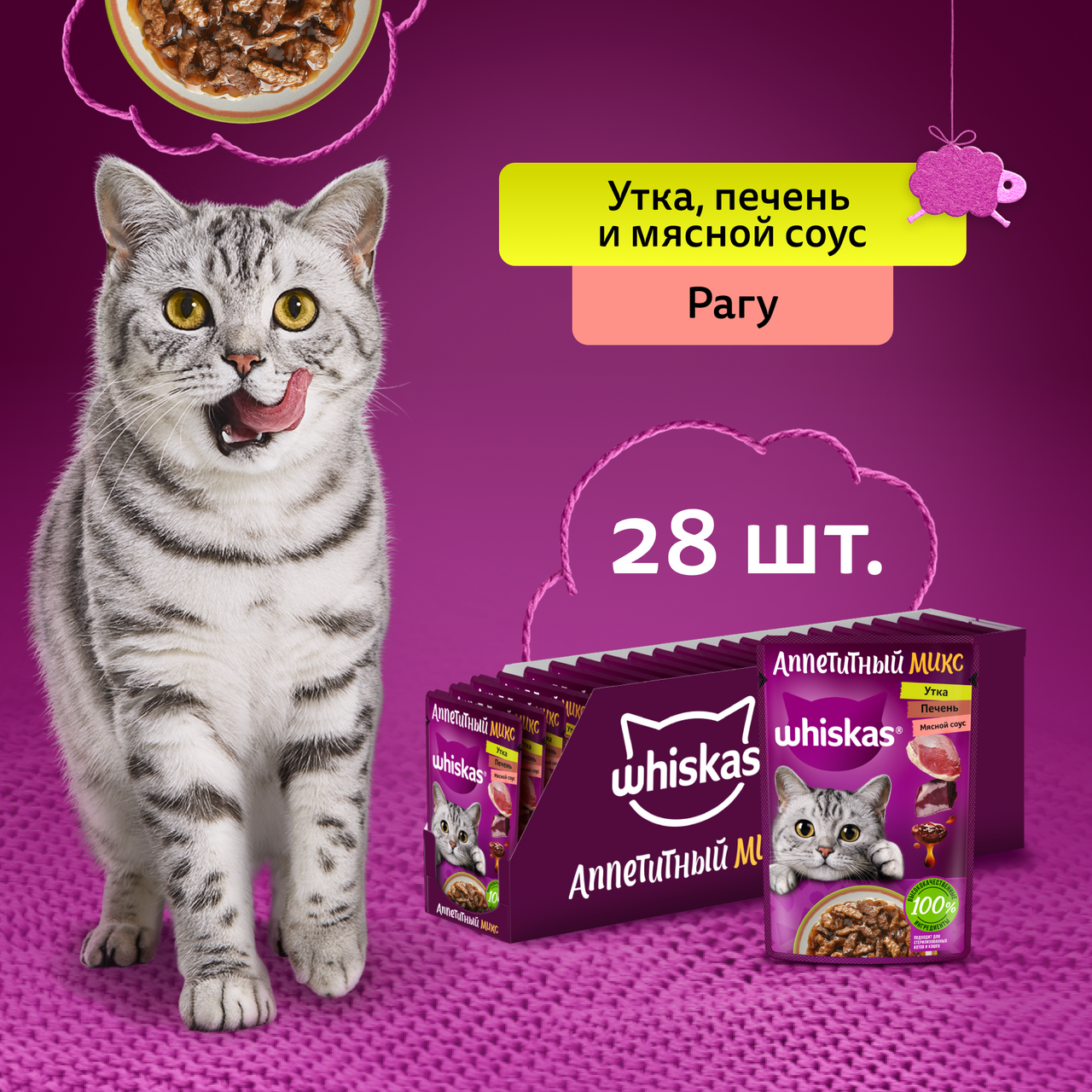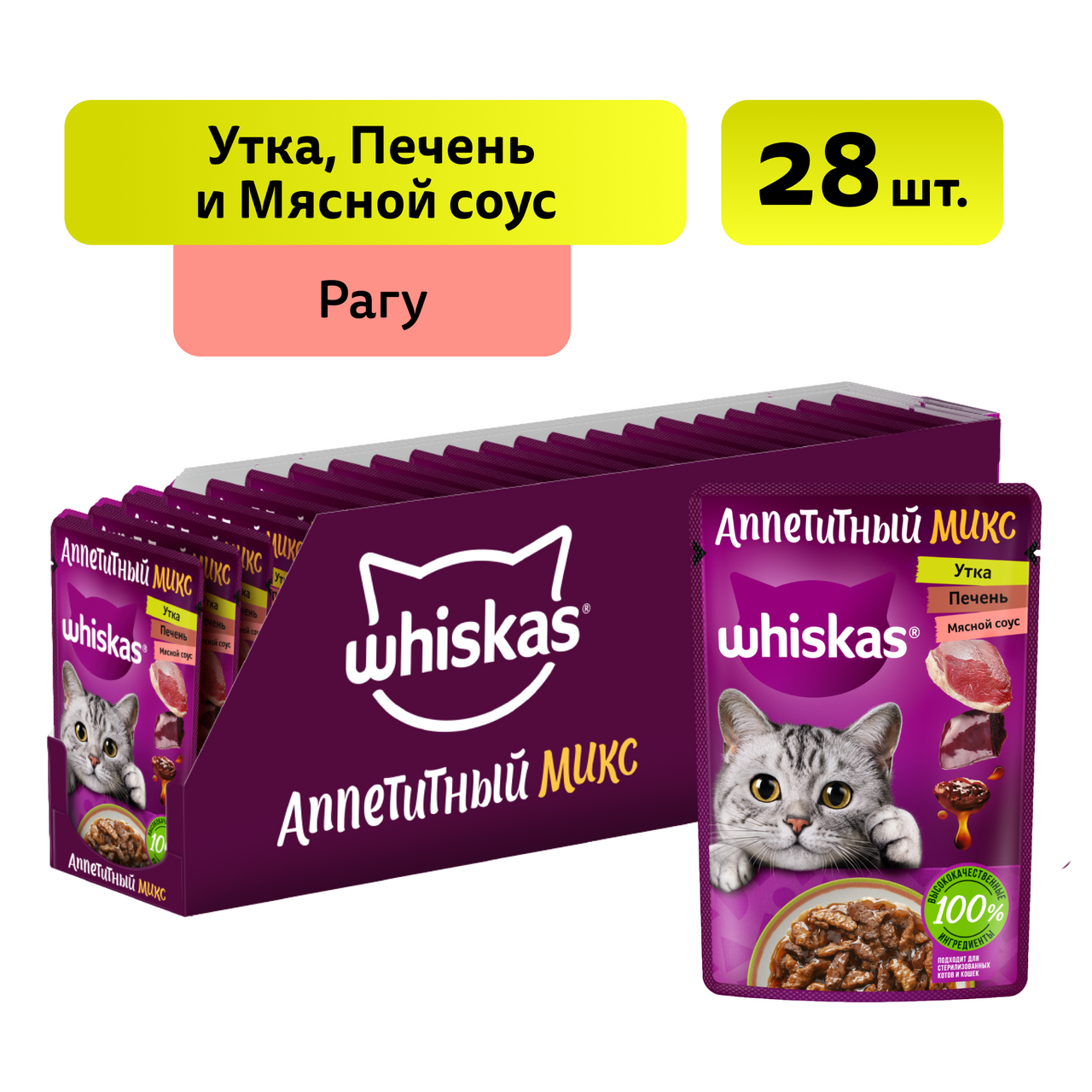 Утка, печень и мясной соус — сразу всё, о чём мечтала ваша кошка, в новой коллекции сбалансированных блюд Whiskas Аппетитный микс для замурррчательной жизни. В каждом из паучей содержится три основных ингредиента: разные виды мяса или морепродуктов смешиваются в нежнейшем соусе или желе, чтобы вы воплощали мечты своих любимцев. Подходит для стерилизованных котов и кошек. 100% сбалансированный рацион. Всё необходимое для поддержания здоровья: Омега-6, кальций, фосфор и таурин, витамин Е, цинк. Вкусное питание с высоким содержанием белка на каждый день. 100% натуральные высококачественные ингредиенты: мясо и субпродукты – без добавления ароматизаторов и консервантов. Ваша кошка будет мурчать от удовольствия!