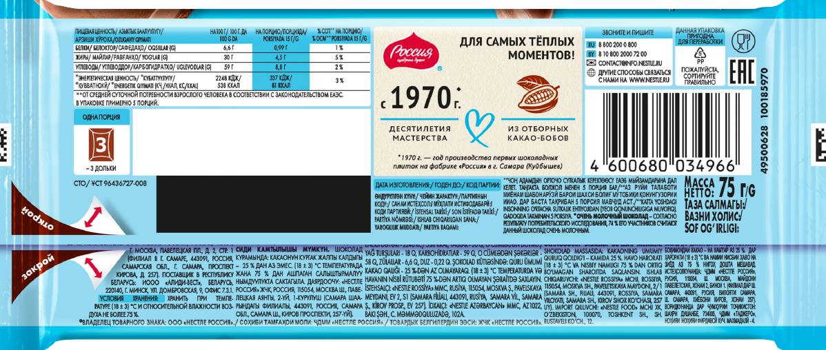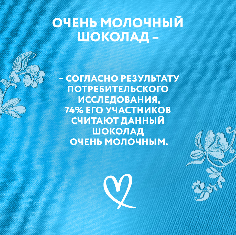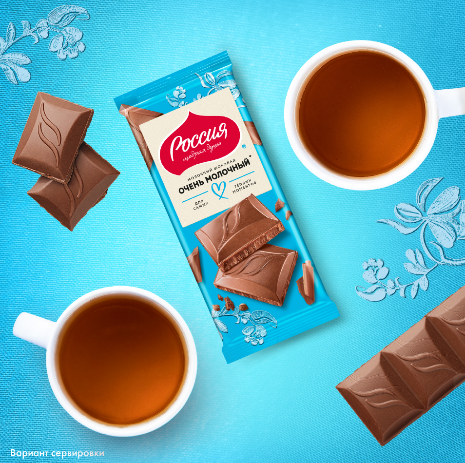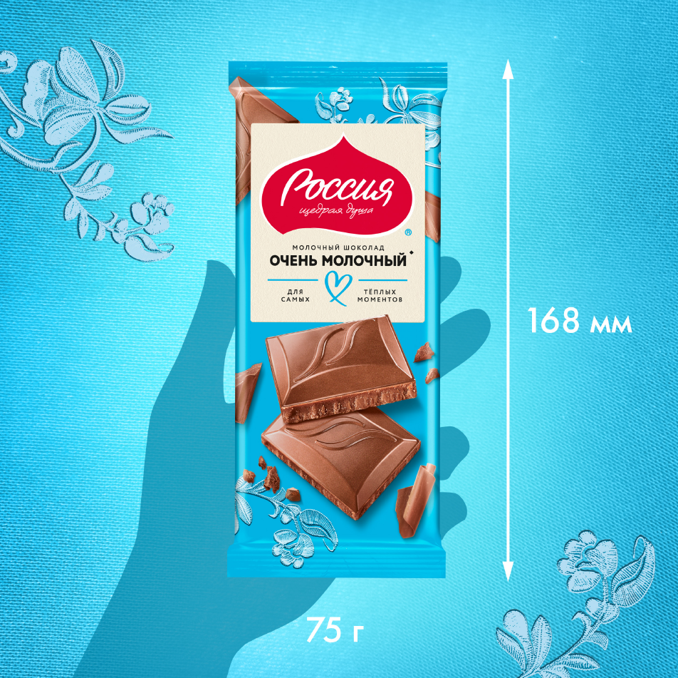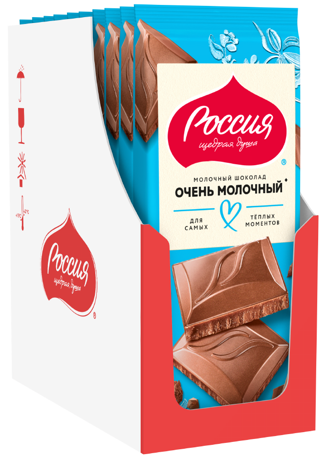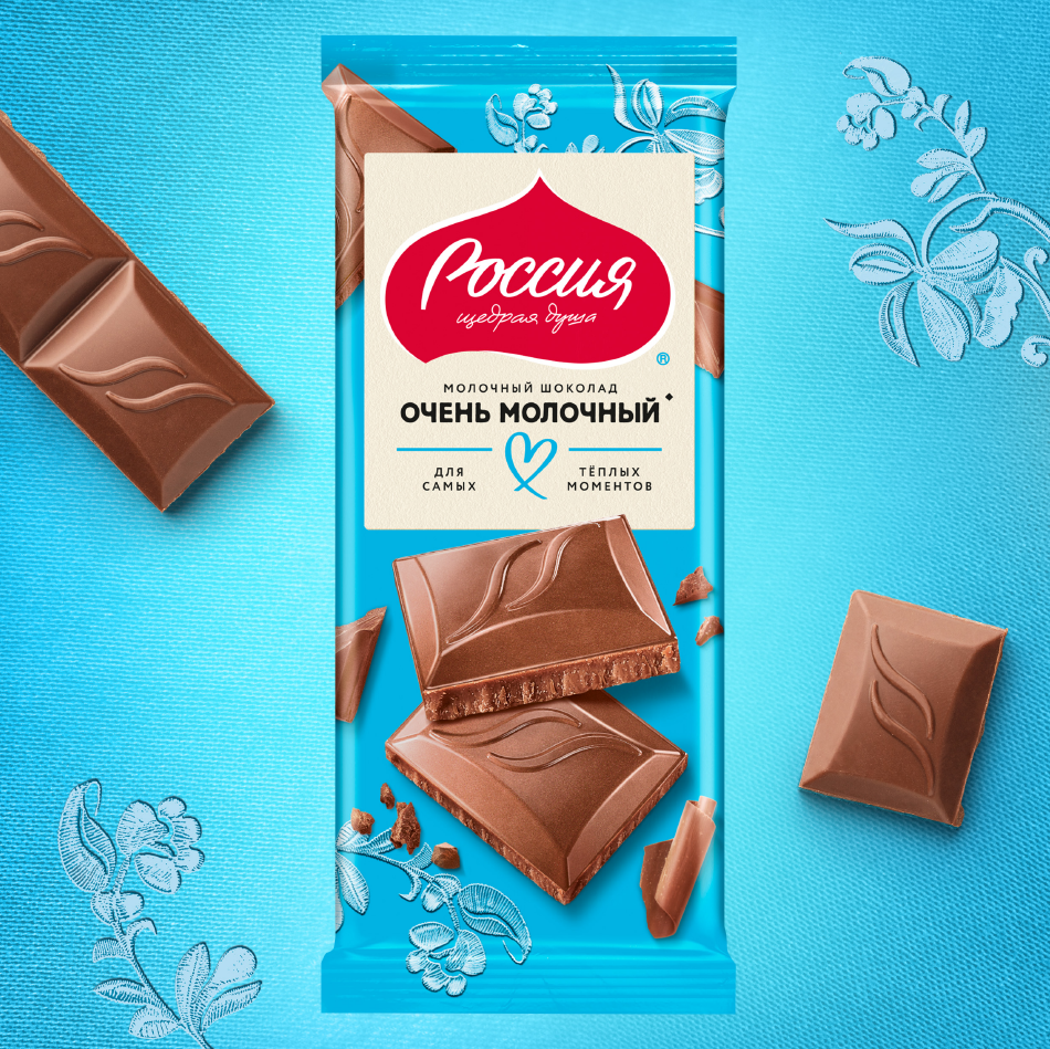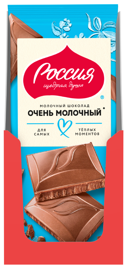 Шоколад Очень молочный от бренда Россия- щедрая душа! - это нежная классика, способная растопить ваши сердца. Отборное молоко, качественные какао-бобы и элегантный дизайнупаковки доставят вам эстетическе и гастрономическое удовольствие. Изящная обновленная форма дольки шоколада раскрывает весь яркий и насыщенный молочный вкус. Кусочки шоколада медленно таят во рту, продлевая ваше удовольствие.