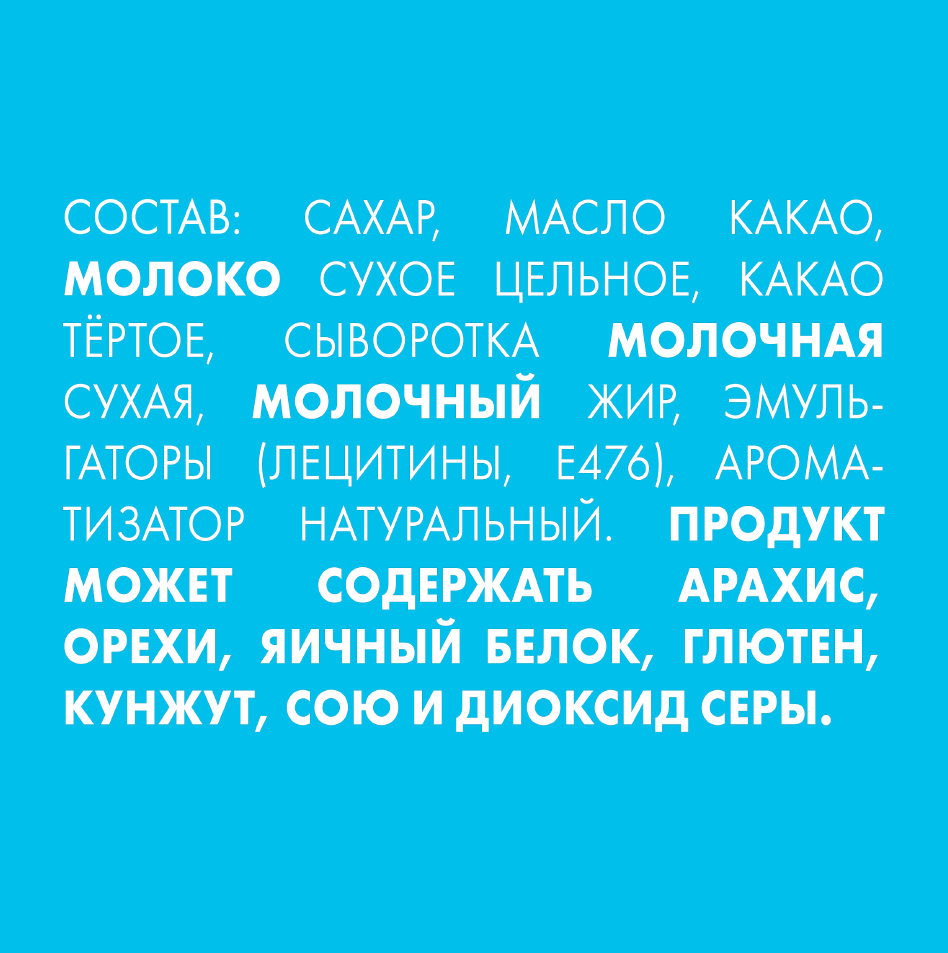 Сахар, масло какао, молоко сухое цельное, какао тёртое, сыворотка молочная сухая, молочный жир, эмульгаторы (лецитины, Е476), ароматизатор натуральный.