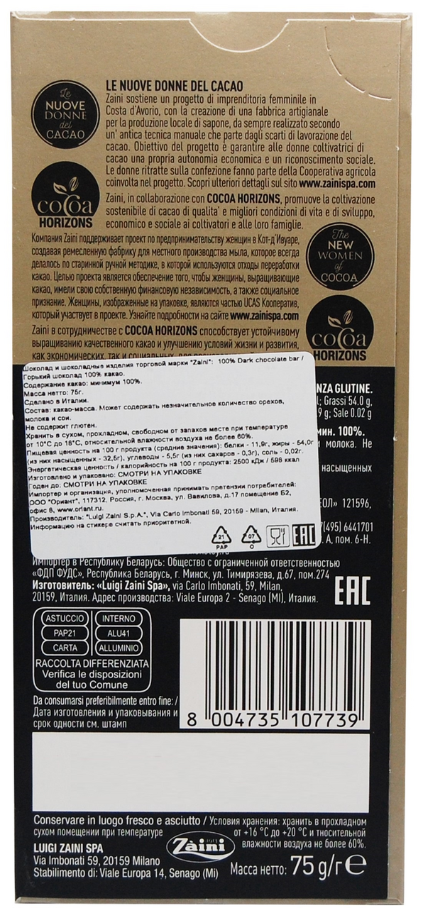 Итальянская компания Zaini производит шоколадные изделия более 100 лет. Компания уделяет самое пристальное внимание отбору и исследованию сырья, а так же безопасности всего производственного цикла для создания шоколада и конфет с их неповторимым вкусом. Качество продукции гарантировано самыми строгими международными сертификатами. The New Women Of Cocoa - это название проекта, которого придерживается итальянская компания Zaini в поддержку женщин, выращивающих какао в Кот-д'Ивуаре. Проект помогает создавать лучшие экономические и социальные условия для фермеров и их семей, а также борется за права африканских женщин. Темный шоколад с содержанием какао 100% обладает выраженным и глубоким вкусом, а при разламывании край кусочков остается ровным. Разные оттенки вкуса горько шоколада раскрываются, когда он начинает таять во рту. В составе только какао-масса африканских какао-бобов. Благодаря натуральным ингредиентам, такой шоколад рекомендован для диетического питания.