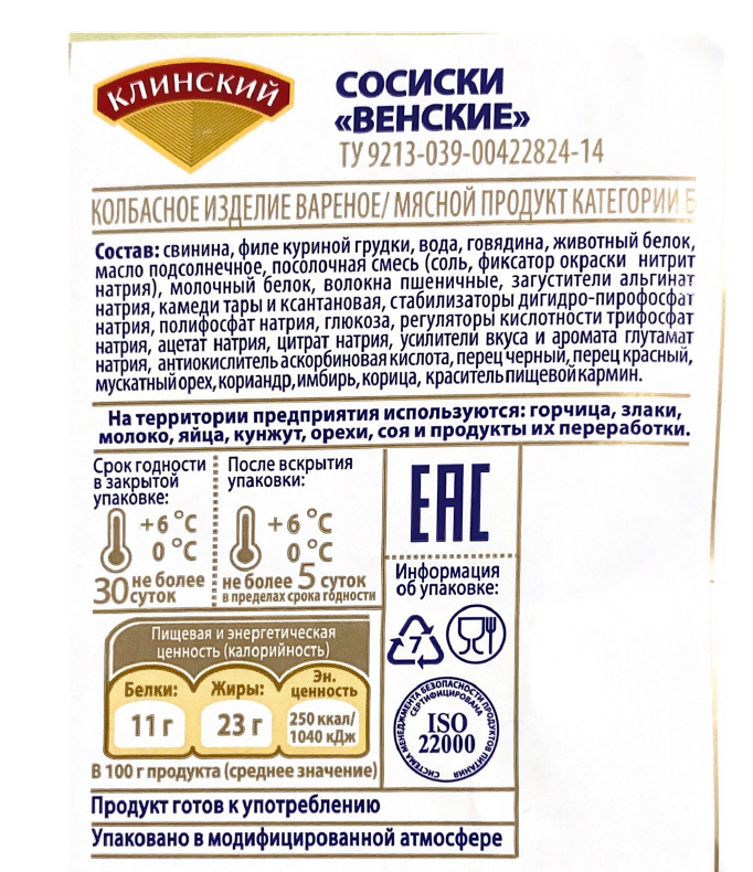 Сосиски приготовлены по фирменному рецепту клинских технологов из говядины и свиной грудинки с добавлением мускатного ореха. Яркий акцент во вкусе сосисок придает легкий аромат копчения. Прекрасное решение для быстрого, но сытного завтрака, обеда, ужина или перекуса в течение дня. Изготовлены по фирменному рецепту из нежной свиной грудинки и говядины. Мускатный орех придает колбасным изделиям легкую пикантность, а приятный аромат копчения делает их особенно аппетитными. Рекомендуется подавать в сочетании с картофельным пюре или макаронами, а также использовать для приготовления изумительной выпечки и хот-догов.
