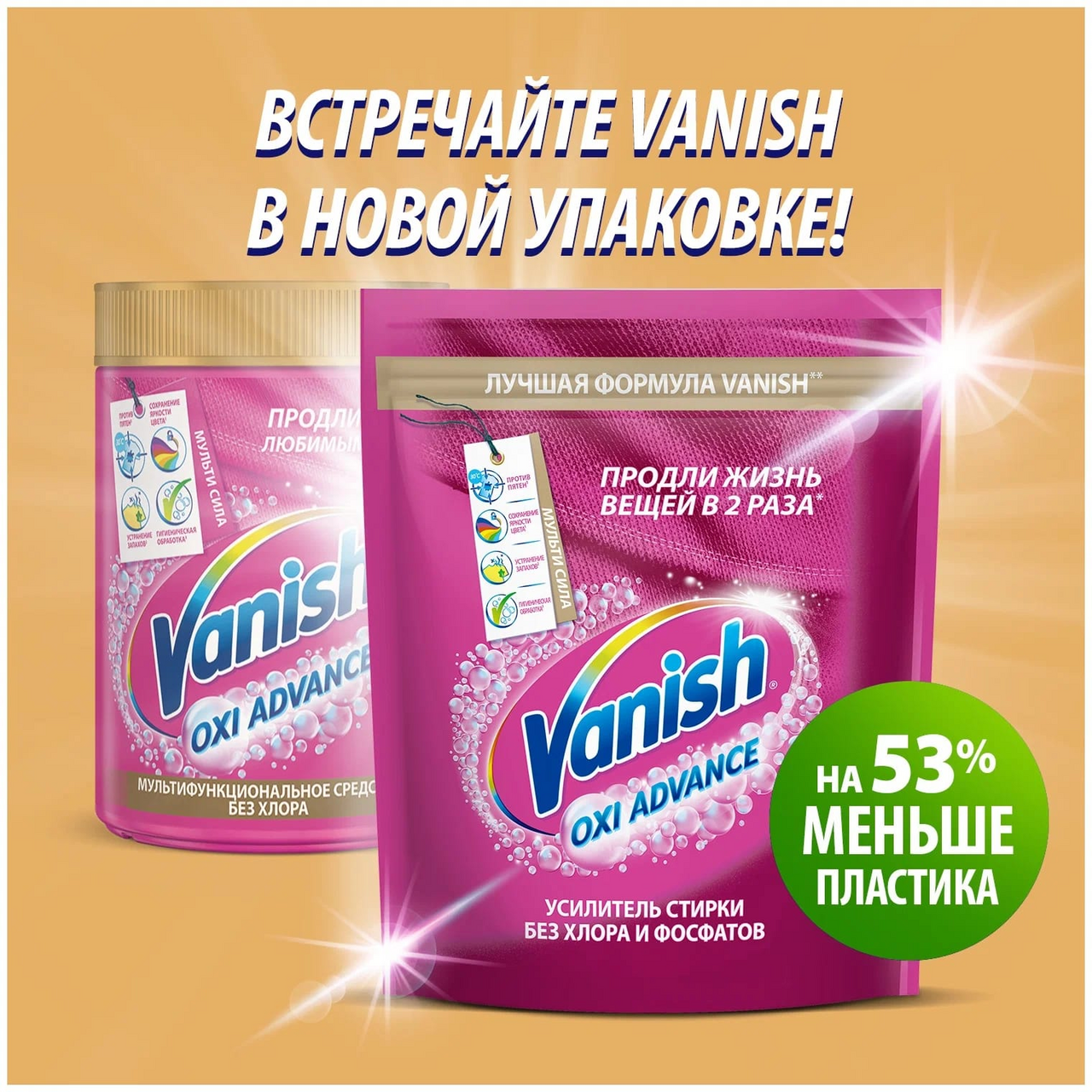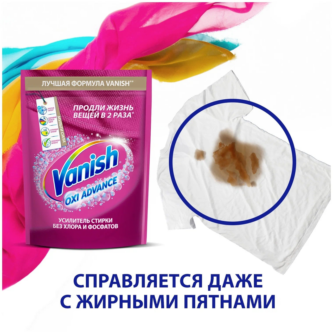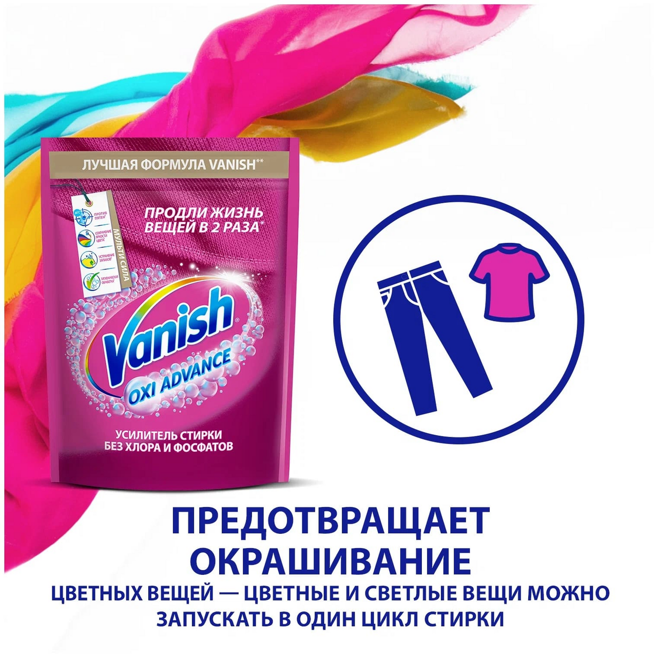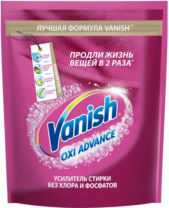 Vanish Мультисила – новое мультифункциональное средство без хлора для усиления качества стирки цветных тканей. Теперь Ваниш не только эффективно удаляет пятна, но и предотвращает окрашивание ткани, избавляет от неприятного запаха и производит гигиеническую обработку! Ваниш Мультисила – одно решение трех проблем! Продли жизнь любимым вещам с Vanish!