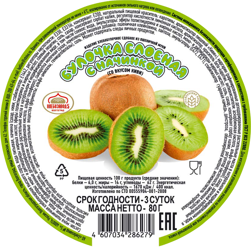 Мука пшеничная хлебопекарная высшего сорта, вода питьевая, начинка сахар, киви, стабилизатор: Е1442, регуляторы кислотности: Е330, Е331iii, консервант: Е200, натуральный пищевой краситель: Е160а-ẞ-каротины, ароматизатор пищевой Киви, маргарин рафинированные дезодорированные растительные масла в натуральном и модифицированном виде, в том числе соевое; вода, эмульгаторы: моно - и диглицериды жирных кислот, эфиры полиглицерина и жирных кислот, соевый лецитин; соль, сахар, консервант сорбат калия, регулятор кислотности лимонная кислота, ароматизатор, краситель бета-каротин, антиокислители: аскорбиновая кислота, альфа-токоферол, сахар, дрожжи хлебопекарные прессованные, маргарин рафинированные дезодорированные растительные масла в натуральном и модифицированном виде, в том числе соевое; вода, эмульгаторы: эфиры полиглицерина и жирных кислот, моно - и диглицериды жирных кислот; соль, сахар, консервант сорбат калия, регулятор кислотности лимонная кислота, ароматизатор, краситель бета-каротин, антиокислители: аскорбиновая кислота, альфа-токоферол, сыворотка молочная сухая, комплексная пищевая добавка: пшеничная клейковина, лактоза, эмульгаторы Е472, Е471, стабилизатор гуаровая камедь, декстроза, обезжиренное молоко, антиокислитель аскорбиновая кислота, вещество для обработки муки - цистеин, вспомогательные вещества ферменты: альфа-амилазы, гемицеллюлазы, соль.