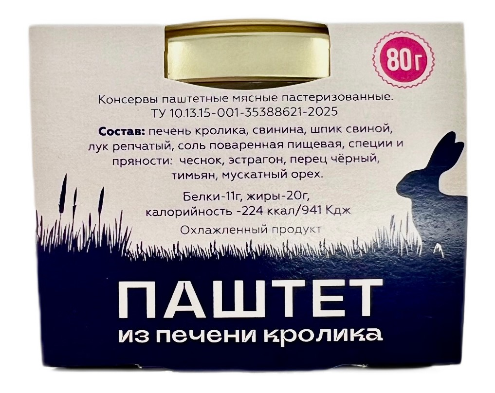 Печень кролика, свинина, шпик свиной, лук репчатый, соль поваренная пищевая, специи и пряности: чеснок, эстрагон, перец черный, тимьян, мускатный орех.