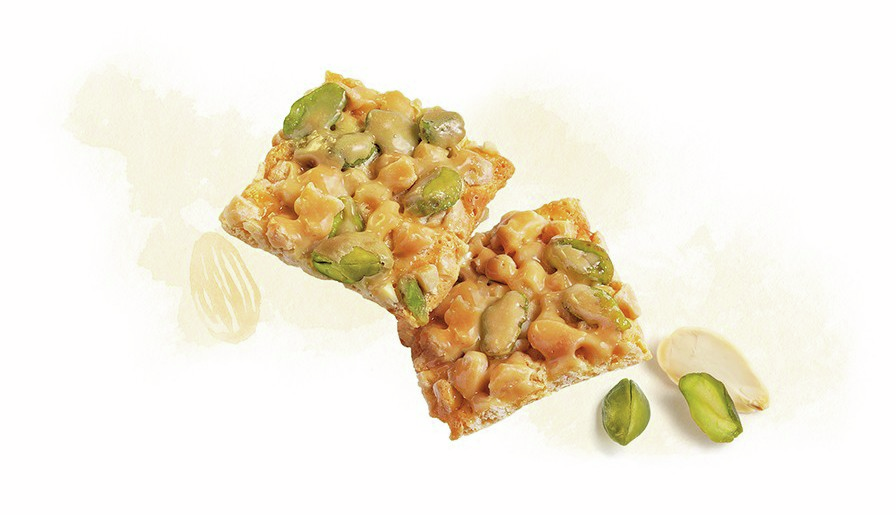 Миндаль 26 %, сахар, пшеничная мука, фисташки 10%, карамелизованный сахар 6 %, картофельный крахмал, кокосовое масло, сироп глюкозы, сливочное масло, порошок яичного белка , пшеничный крахмал, подсолнечное масло, обезжиренное сухое молоко, пекарский мед, эмульгатор (соевый лецитин), сухое цельное молоко, соль, разрыхлитель (гидрокарбонат аммония).