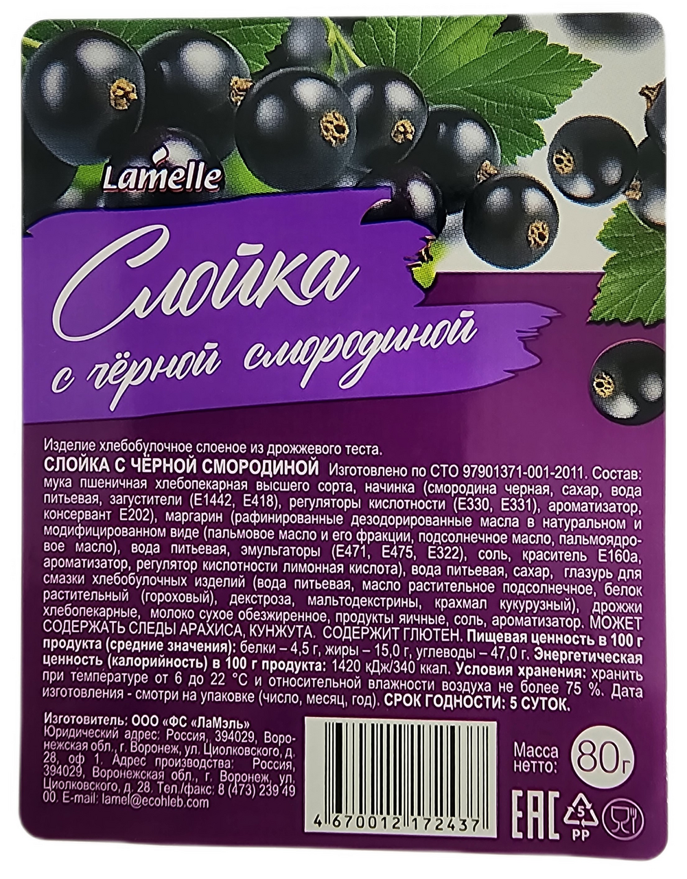 Мука пшеничная хлебопекарная высшего сорта, начинка (смородина черная, сахар, вода питьевая, загустители (E1442, E418), регуляторы кислотности (E330, E331), ароматизатор, консервант E202), маргарин (рафинированные дезодорированные масла в натуральном и модифицированном виде (пальмовое масло и его фракции, подсолнечное масло, пальмоядровое масло), вода питьевая, эмульгаторы (E471, E475, E322), соль, краситель E160а, ароматизатор, регулятор кислотности лимонная кислота), вода питьевая, сахар, глазурь для смазки хлебобулочных изделий (вода питьевая, масло растительное подсолнечное, белок растительный (гороховый), декстроза, мальтодекстрины, крахмал кукурузный), дрожжи хлебопекарные, молоко сухое обезжиренное, продукты яичные, соль, ароматизатор.