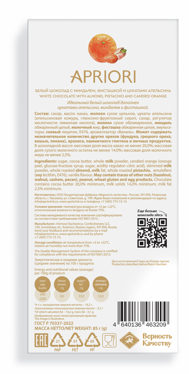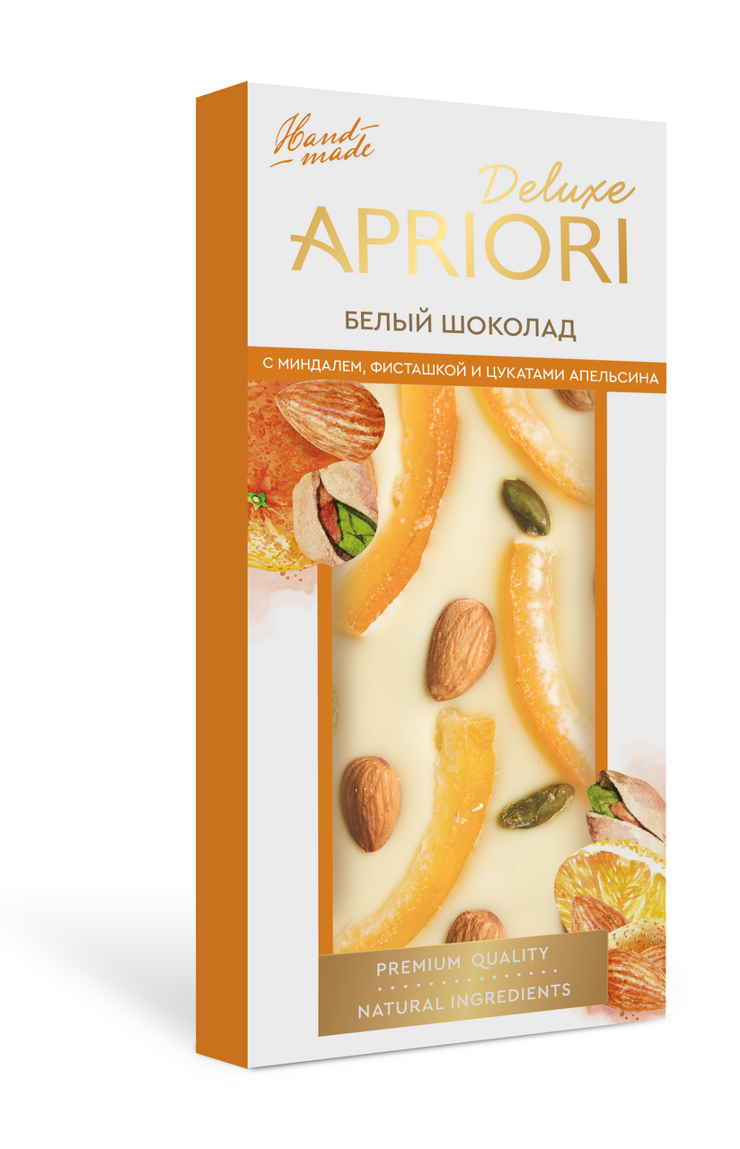 Шоколад Априори Deluxe белый с миндалем фисташками и цукатами апельсина, 85г