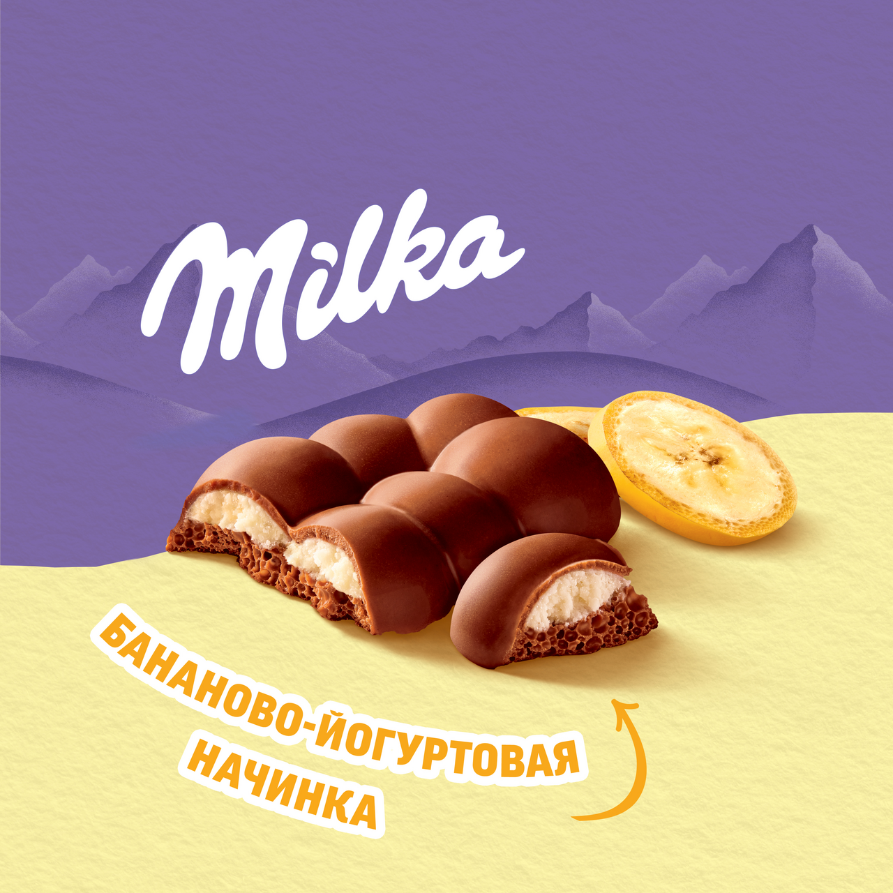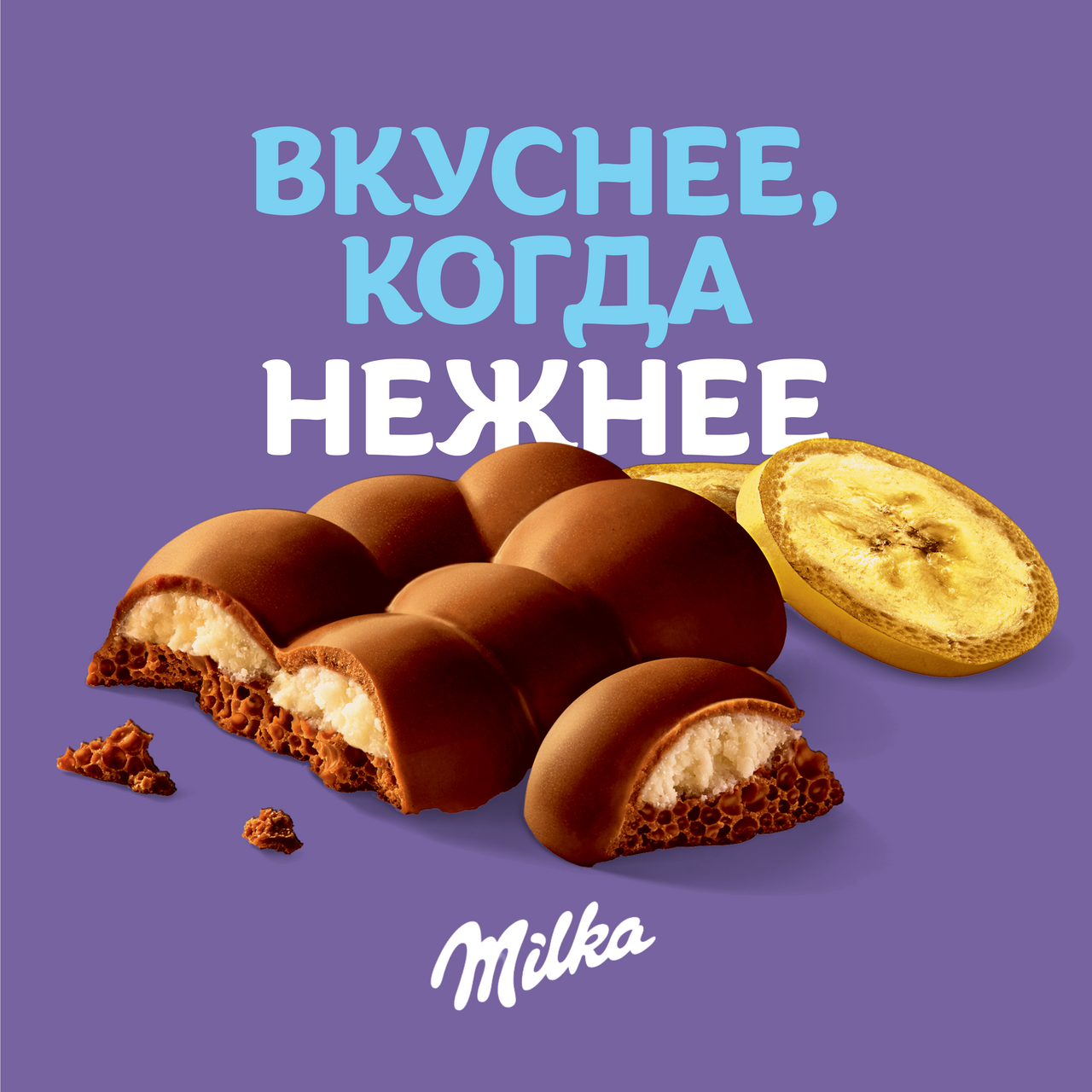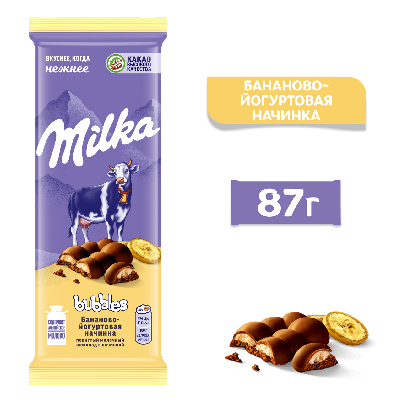 Участвует в конкурсе: Выиграйте кофемашину на сладкое! Совершите покупку товаров-участников на сумму от 1500₽ с 23 октября 2025г. по 14 января 2026г. и получите шанс выиграть кофемашину или другие сладкие призы! Чем больше покупок - тем больше шансов на победу! Подробнее об акции - https://cdn.metro-cc.ru/ru/mndlz_2025.pdf. Milka Bubbles — это нежный пористый шоколад с вкуснейшей банановой начинкой и элегантными йогуртовыми нотками. Шоколад молочный изготовлен из какао высокого качества с добавлением альпийского молока, поэтому он тает во рту и раскрывает нежность в каждом, кто его пробует! Молочный шоколад Milka Bubbles обладает воздушной текстурой, которую дополняет прослойка с насыщенным бананово-йогуртовым вкусом. Нежность шоколада, яркие нотки йогурта и банана — идеальное сочетание для невероятного наслаждения и беззаботного летнего настроения! Шоколад пористый прекрасно дополнит завтрак, станет отличным вариантом для быстрого перекуса и сладким угощением для семейного вечера. Шоколад подойдет к чаю, кофе и другим напиткам. Его удобно брать с собой н�� работу, учебу, в дорогу и на природу. Шоколад Milka с начинкой — это не только сладость к чаю. Это простой способ напомнить близким о своих чувствах, подарить им заботу и нежность. Преподнесите шоколадку в подарок любимому человеку, чтобы наполнить его день искренним теплом. Создавайте приятные моменты вместе с Milka!