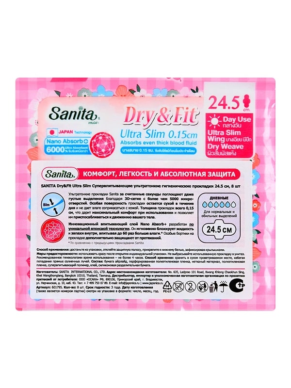 Ультратонкие прокладки Sanita за считанные секунды поглощают даже густые выделения благодаря 3D-сетке с более чем 5000 микроотверстий. Особая поверхность прокладки остается сухой в течение дня и не дает влагесоприкасаться с кожей.Прокладки Sanita нежно прилегают к телу и не раздражают деликатную зону. Толщина прокладок всего 0,15 см, что дарит максимальный комфорт в течение дня и позволяет им присп��сабливаться к движению вашего тела.Инновационный впитывающий слой Nano Absorb+ разработан по уникальной японской технологии.Он мгновенно блокирует жидкость и запахи внутри, впитывая до 60 раз больше влаги