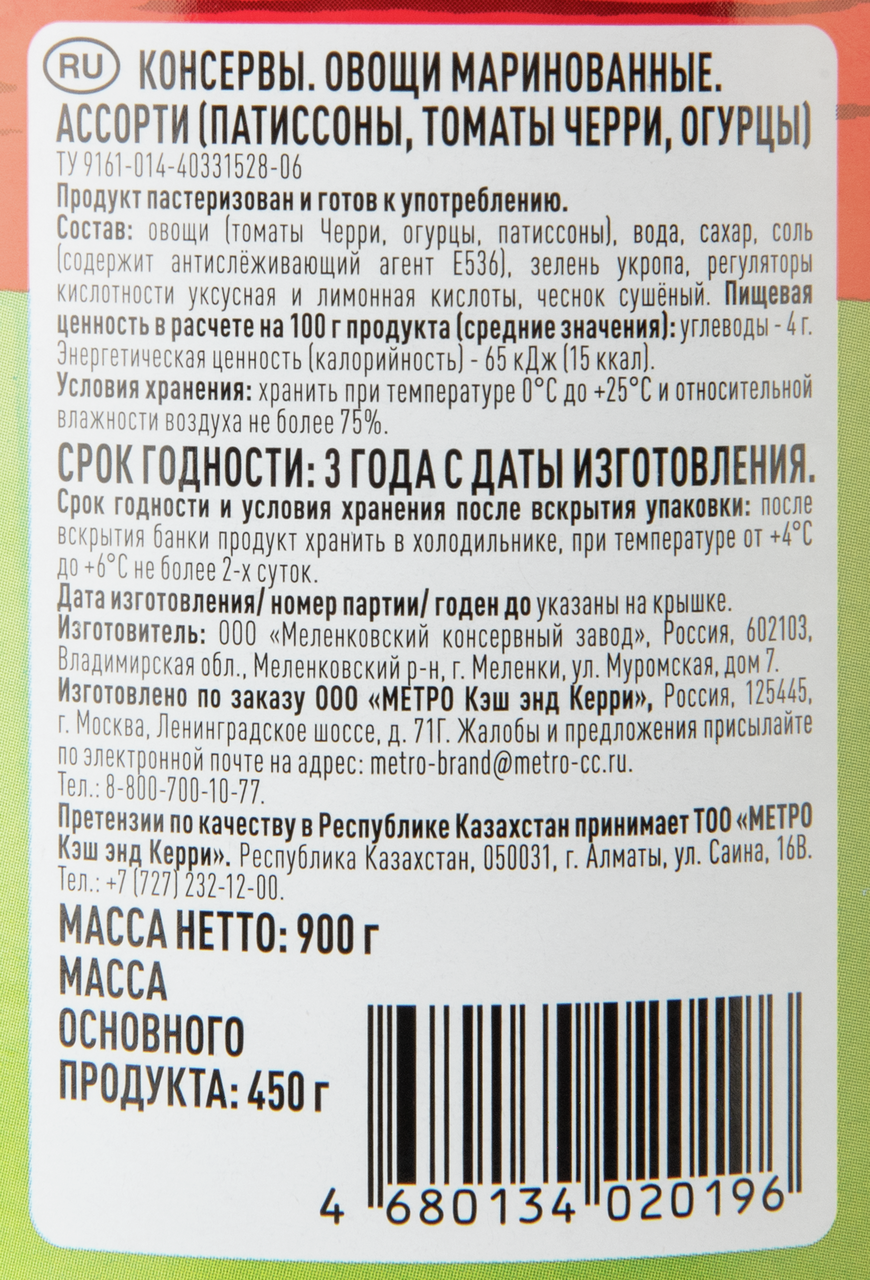 Обладает приятным выразительным вкусом. Оно изготовлено из томатов черри, патиссонов и огурцов с добавлением укропа и чеснока. Ассорти можно подавать на стол в качестве отдельной закуски, предлагать как сопровождение к блюдам из мяса, птицы и картофеля.